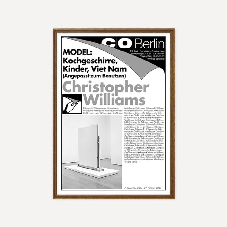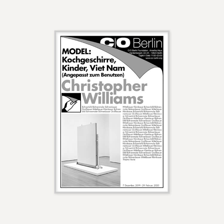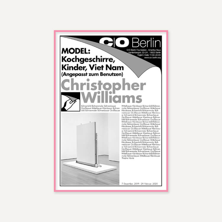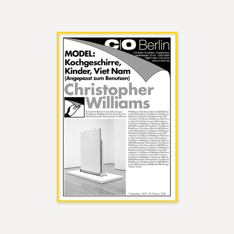 2019년 베를린 사진 미술관 C/O Berlin에서 열린 크리스토퍼 윌리엄스(Christopher Williams)의 〈MODEL : Kochgeschirre, Kinder, Viet Nam〉 전시회 포스터입니다. 그는 후기 자본주의 시대의 산업 문화 속에서 이미지의 기능과 의미를 탐구합니다. 그의 작품은 1960년대 광고, 냉전 시대, 팝 아트, 자본주의 리얼리즘, 신즉물주의, 초현실주의에 이르는 폭넓은 예술사적 맥락을 아우르고 있습니다.