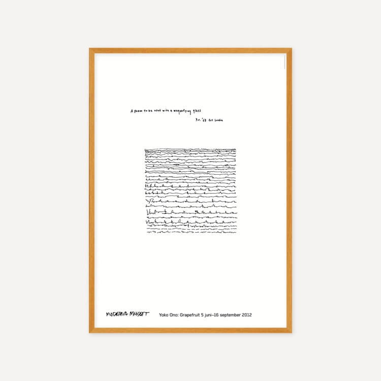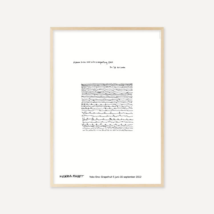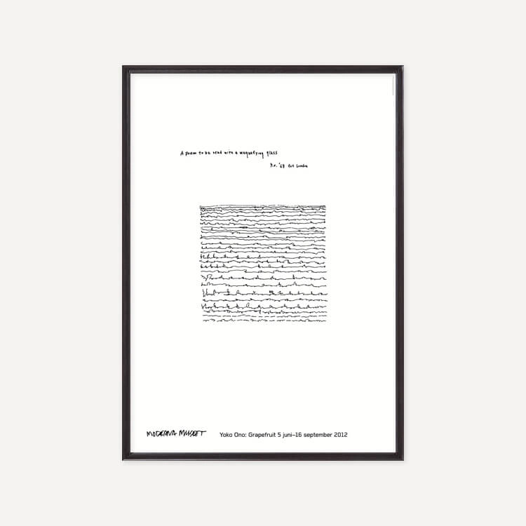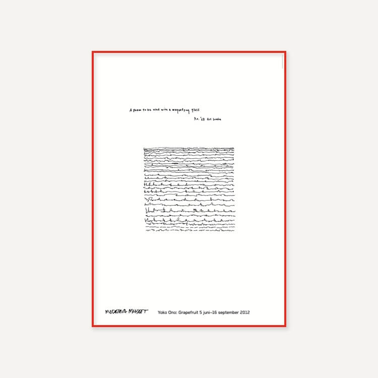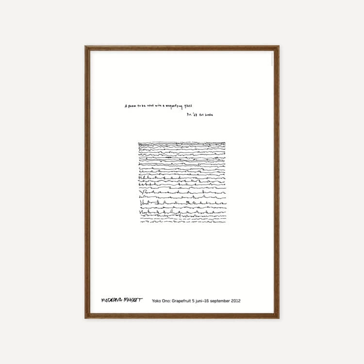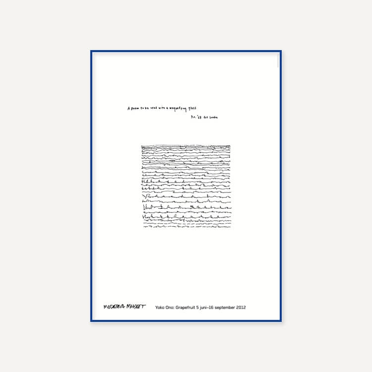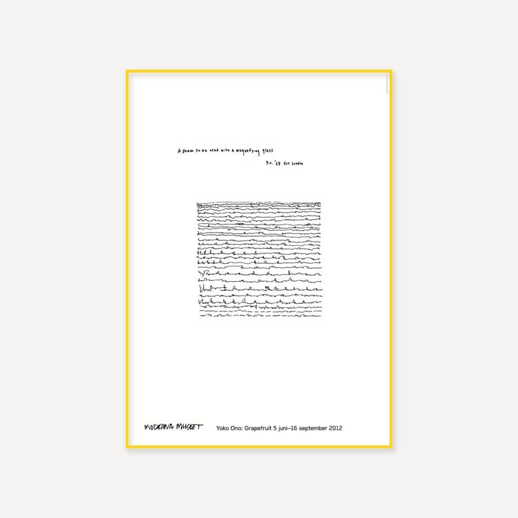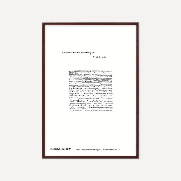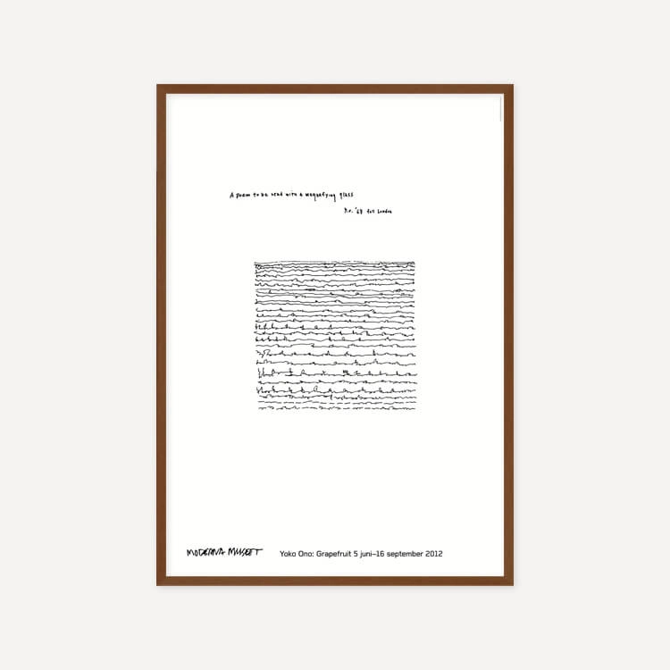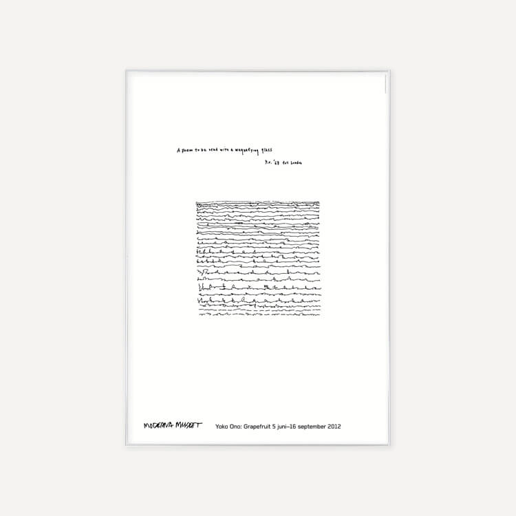 개념 미술의 거장 요코 오노(Yoko Ono)의 작품을 담은 2012년 스웨덴 스톡홀름 현대미술관(Moderna Museet) 전시 포스터입니다. 1961년에 처음 구상된 이 작품은 아주 작은 글씨를 돋보기로 읽게 하여 관람객이 직접 작품에 참여하도록 유도합니다. 단순히 눈으로 보는 것에서 벗어나 작가의 제안에 따라 행동하며 예술을 완성해가는 요코 오노만의 독특한 방식을 경험할 수 있습니다.