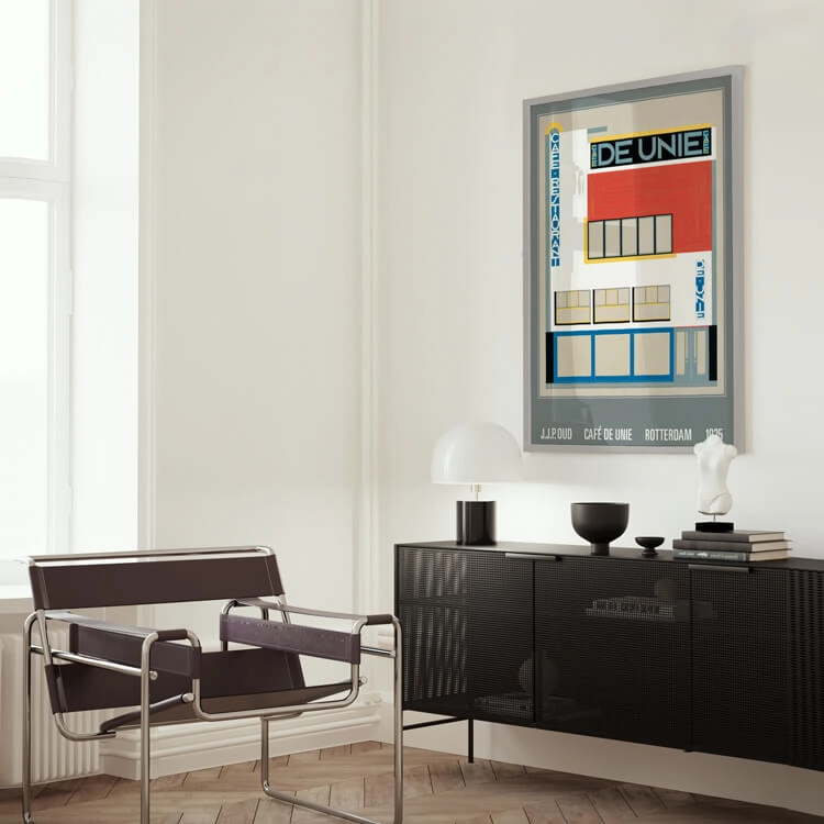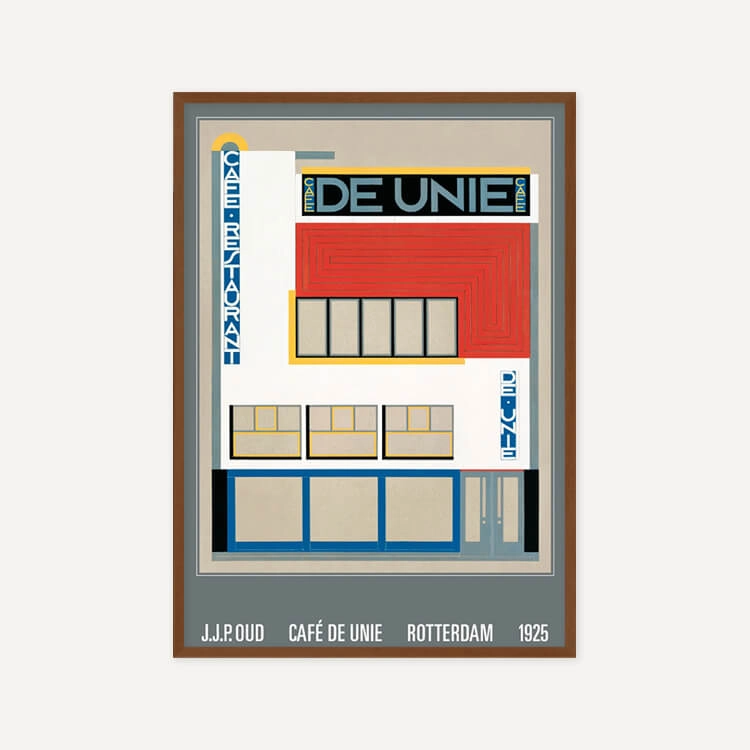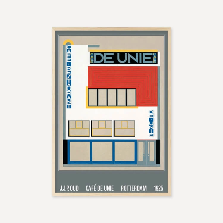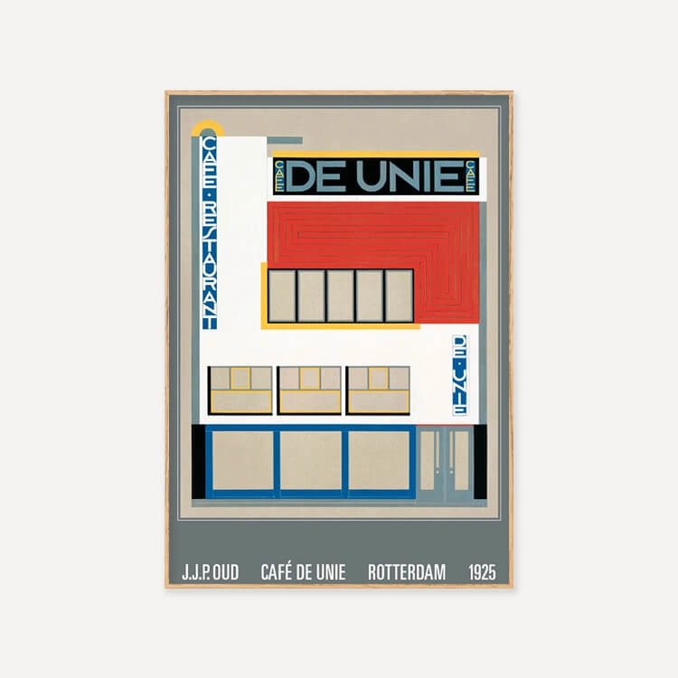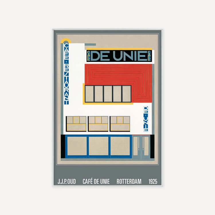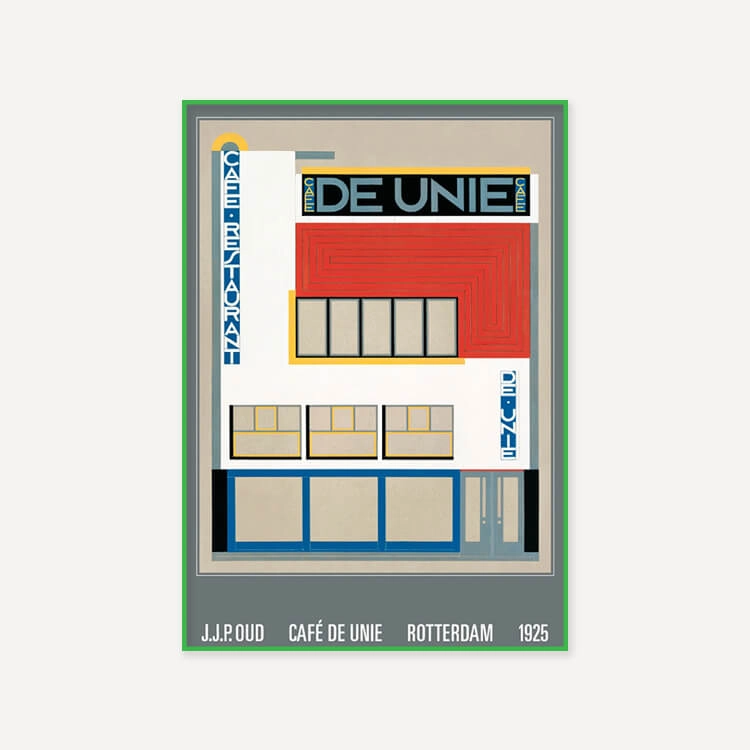 J.J.P.로 알려진 네덜란드 건축가 야코부스 요하네스 피테르 아우드(Jacobus Johannes Pieter Oud)가 디자인한 로테르담의 〈the Cafe de Unie〉 모습입니다. 이 디자인은 뜨거운 칼이 차가운 버터를 관통하듯 주변의 전통적인 네덜란드 건물들과 대조되었으며, 데 스틸 운동의 가장 중요한 아이콘 중 하나로 여겨집니다.