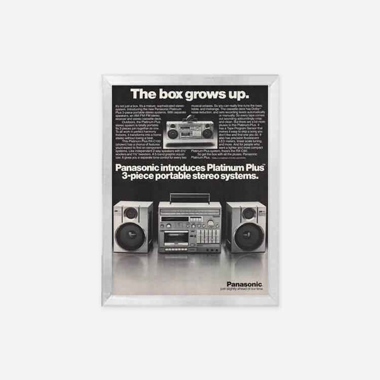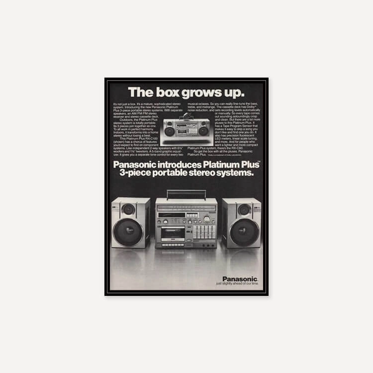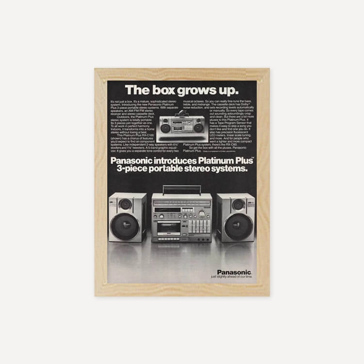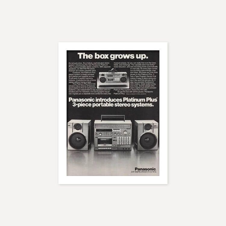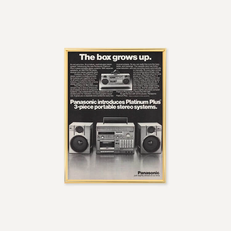 1982년 미국 잡지에 실린 파나소닉 플래티넘 플러스 붐박스(Panasonic Platinum Plus Boom-Box Portable Stereo System) 광고물로, 40년 이상 보존된 오리지널 빈티지 포스터입니다.