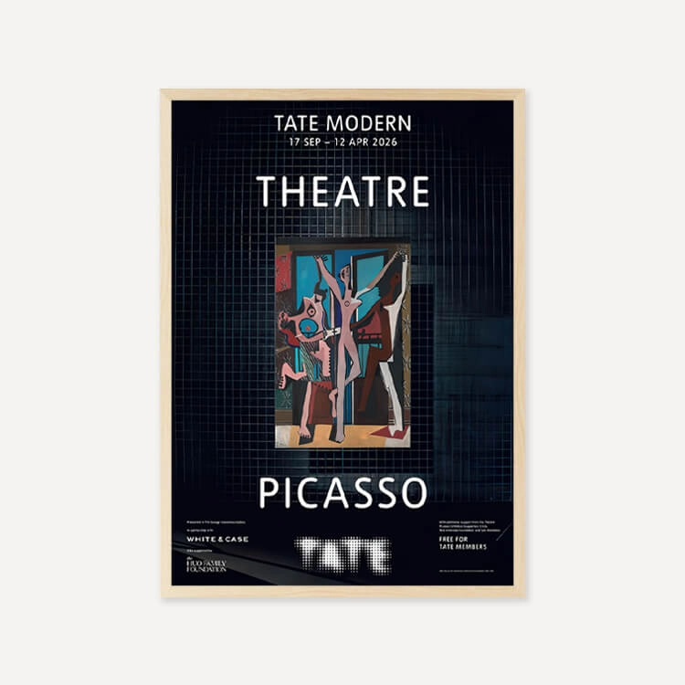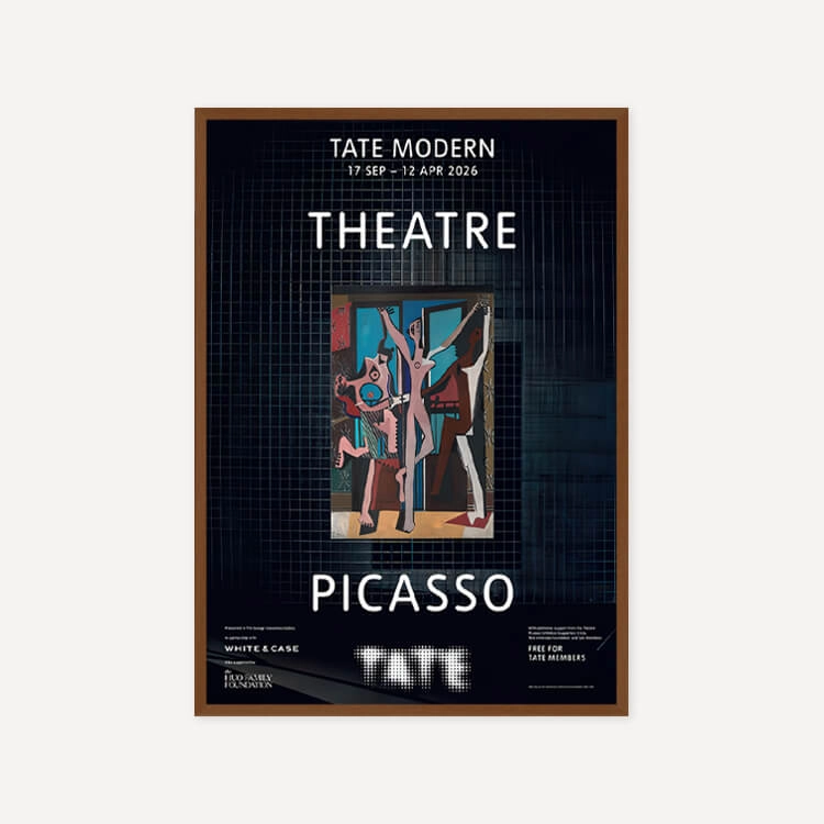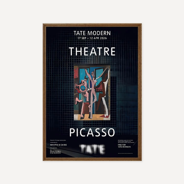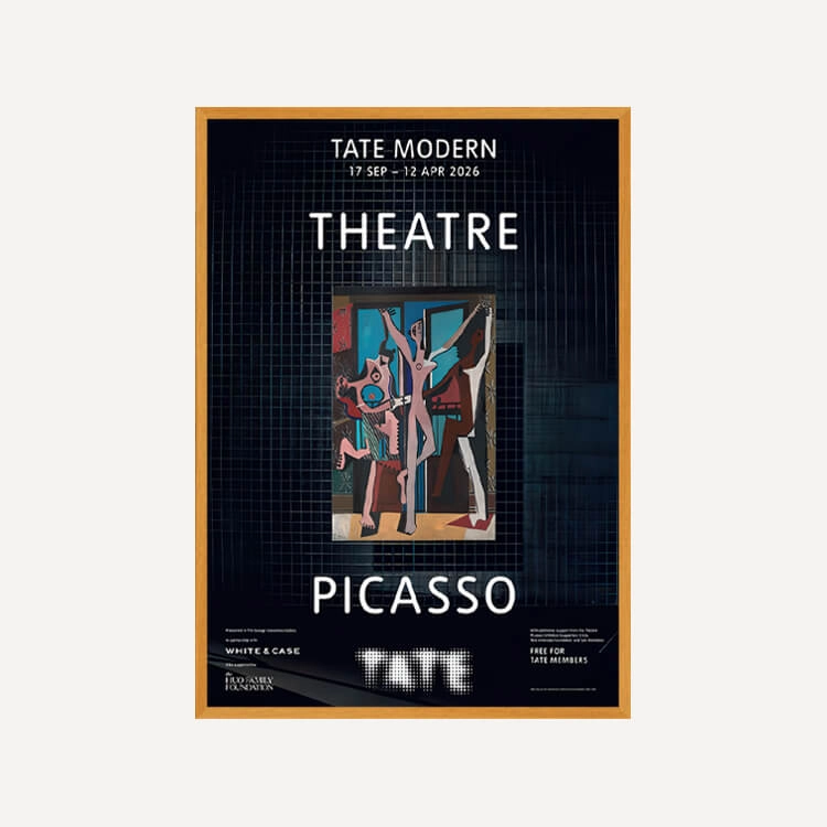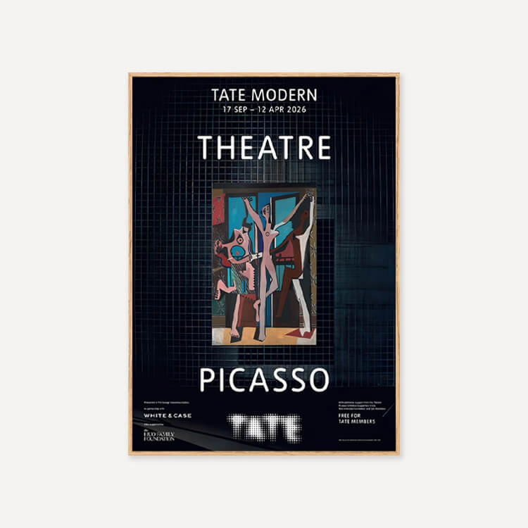 파블로 피카소(Pablo Picasso)의 걸작 <세 명의 무용수(The Three Dancers)> 탄생 100주년을 기념하여 2025년 영국 테이트 모던(Tate Modern) 갤러리 〈Theatre Picasso〉 전시회의 공식 포스터입니다. 이 전시는 갤러리 공간을 하나의 극장으로 탈바꿈시켜 피카소의 예술 세계를 입체적으로 조명했습니다. 영국에서 최초로 선보이는 작품들을 포함해 회화, 조각, 텍스타일 등 매체를 넘나드는 작가의 역동적인 창의성을 담아낸 전시의 기록입니다.