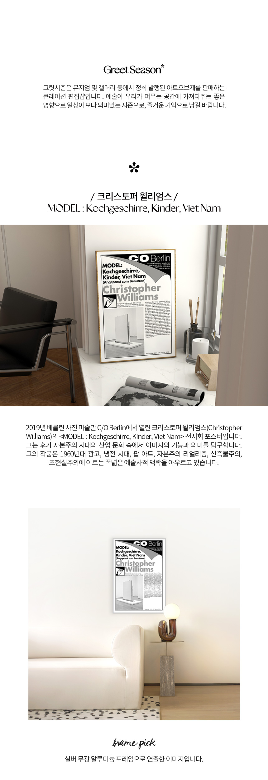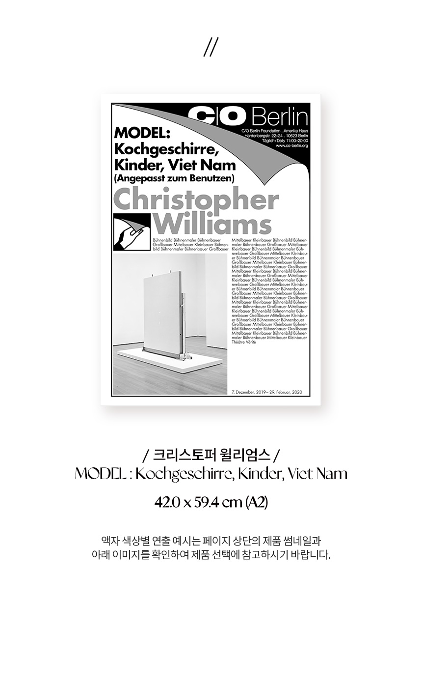 2019년 베를린 사진 미술관 C/O Berlin에서 열린 크리스토퍼 윌리엄스(Christopher Williams)의 〈MODEL : Kochgeschirre, Kinder, Viet Nam〉 전시회 포스터입니다. 그는 후기 자본주의 시대의 산업 문화 속에서 이미지의 기능과 의미를 탐구합니다. 그의 작품은 1960년대 광고, 냉전 시대, 팝 아트, 자본주의 리얼리즘, 신즉물주의, 초현실주의에 이르는 폭넓은 예술사적 맥락을 아우르고 있습니다.