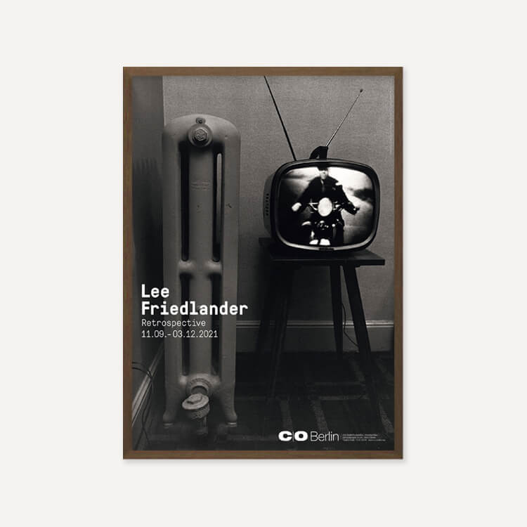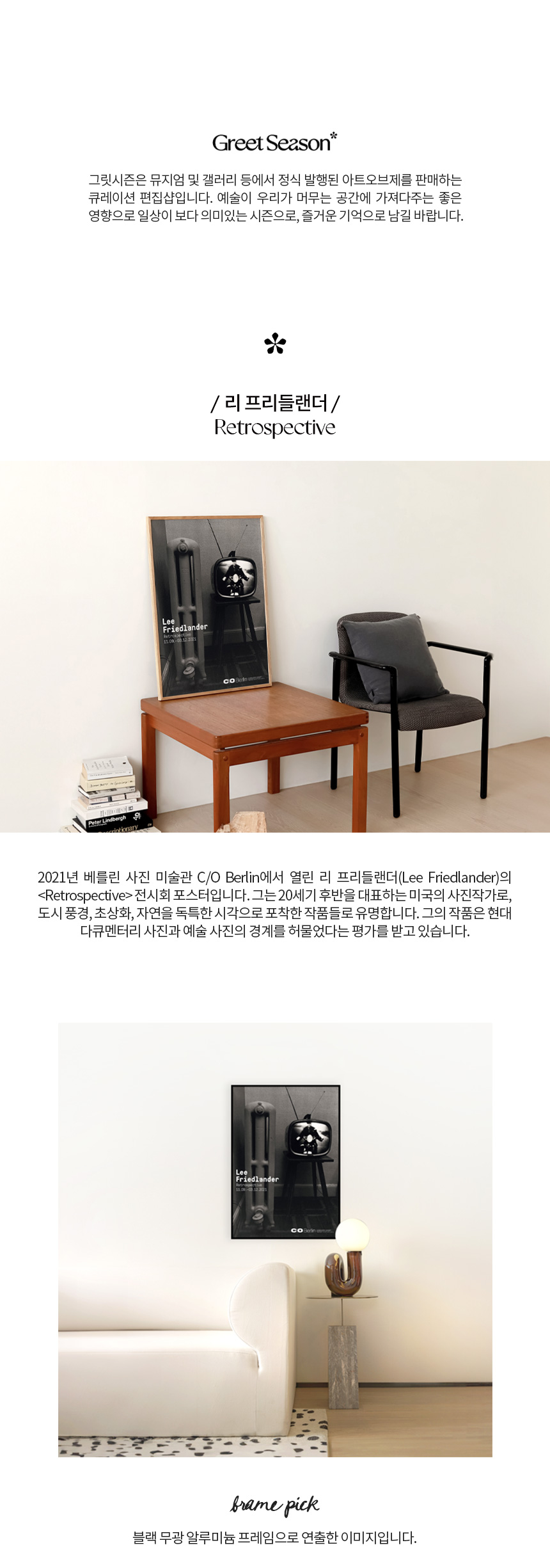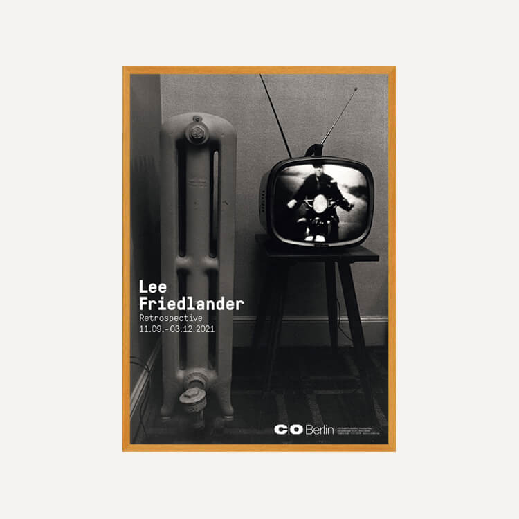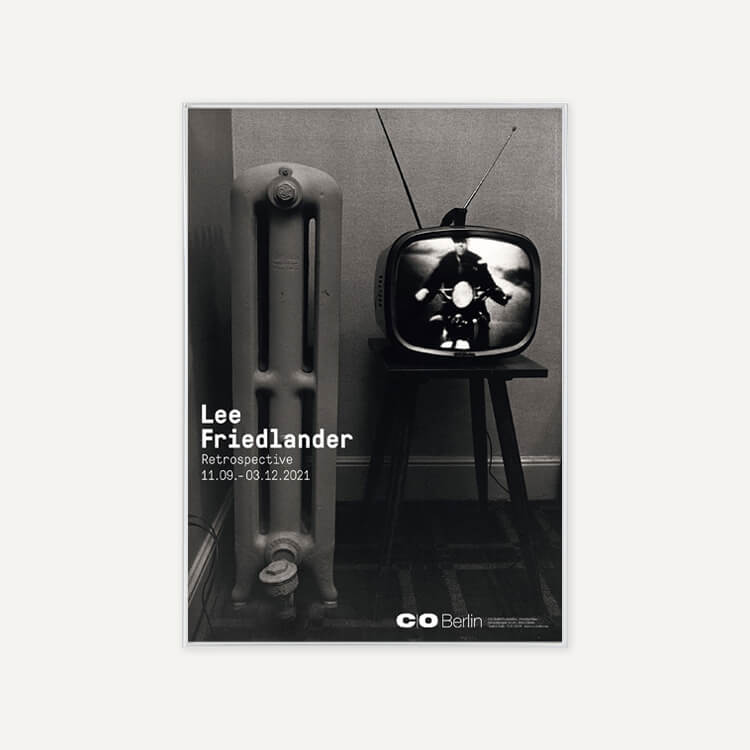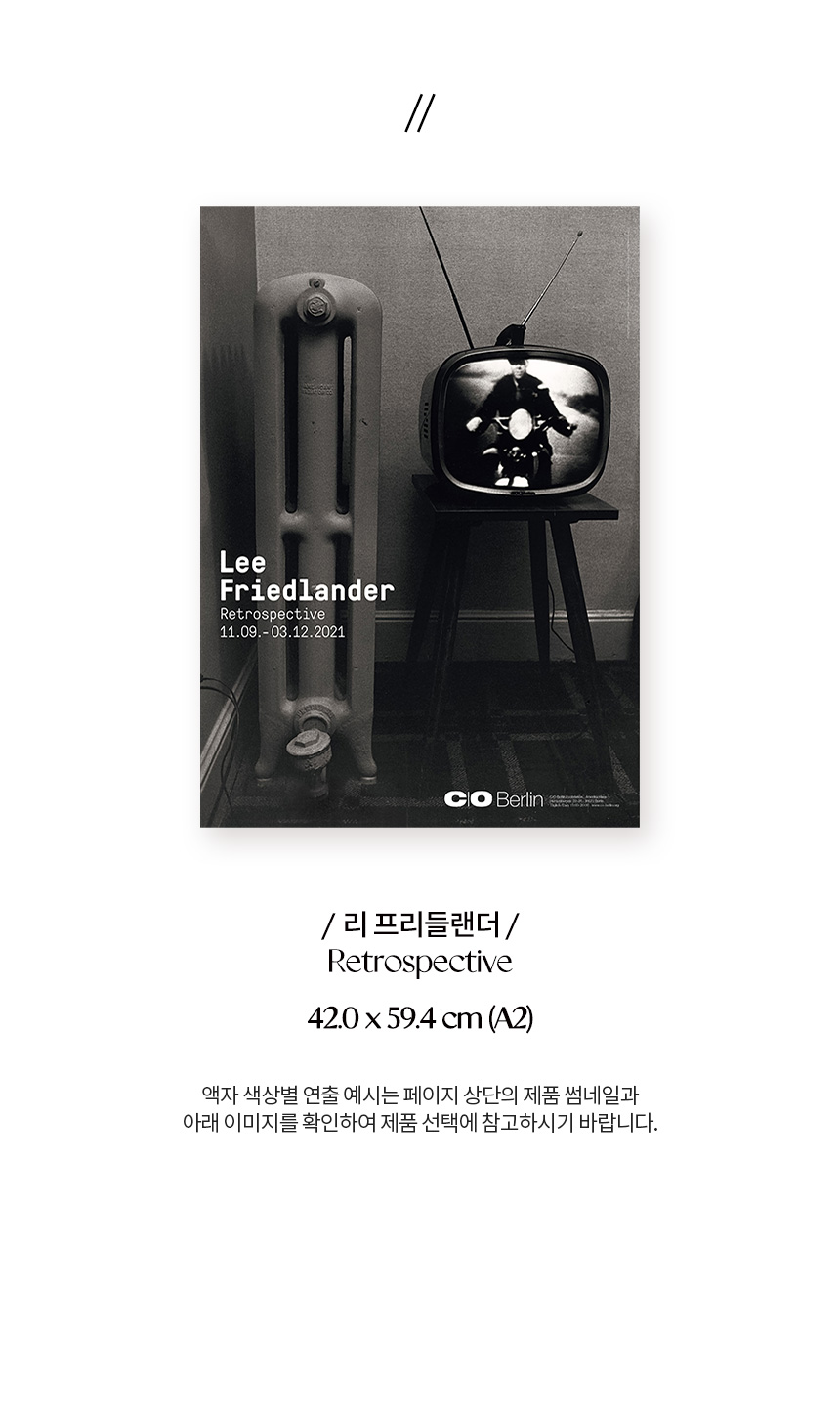 2021년 베를린 사진 미술관 C/O Berlin에서 열린 리 프리들랜더(Lee Friedlander)의 〈Retrospective〉 전시회 포스터입니다. 그는 20세기 후반을 대표하는 미국의 사진작가로, 도시 풍경, 초상화, 자연을 독특한 시각으로 포착한 작품들로 유명합니다. 그의 작품은 현대 다큐멘터리 사진과 예술 사진의 경계를 허물었다는 평가를 받고 있습니다.