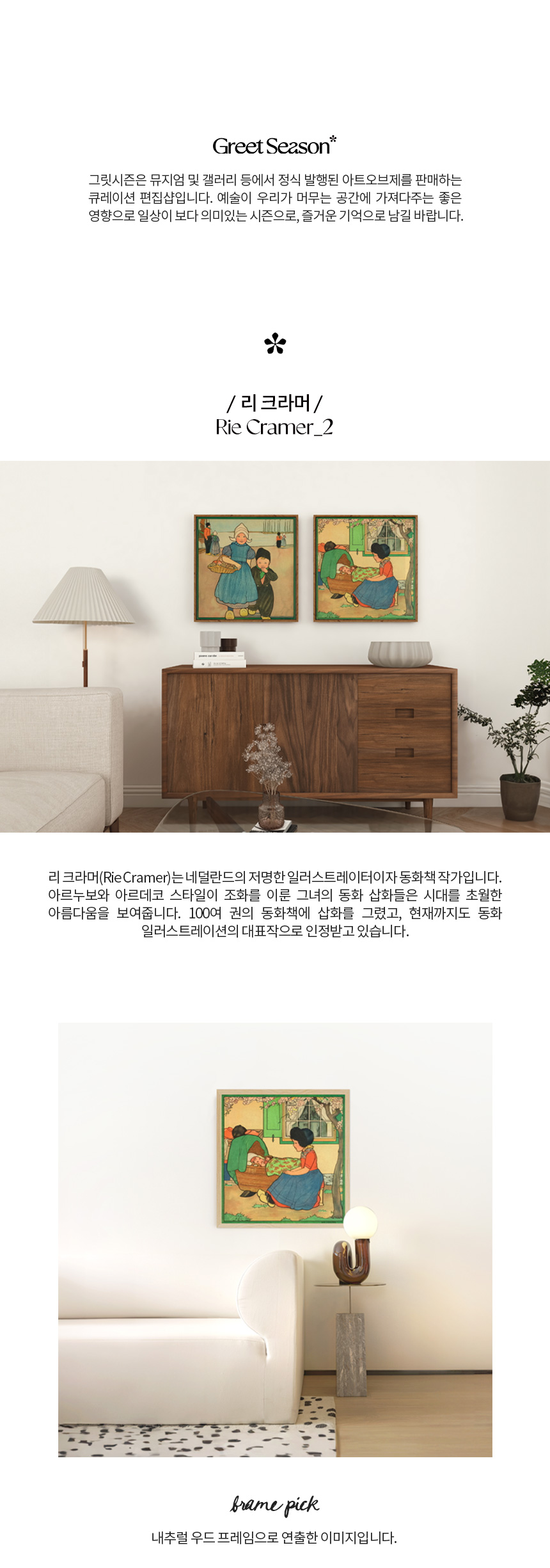 리 크라머(Rie Cramer)는 네덜란드의 저명한 일러스트레이터이자 동화책 작가입니다. 아르누보와 아르데코 스타일이 조화를 이룬 그녀의 동화 삽화들은 시대를 초월한 아름다움을 보여줍니다. 100여 권의 동화책에 삽화를 그렸고, 현재까지도 동화 일러스트레이션의 대표작으로 인정받고 있습니다.