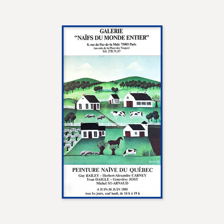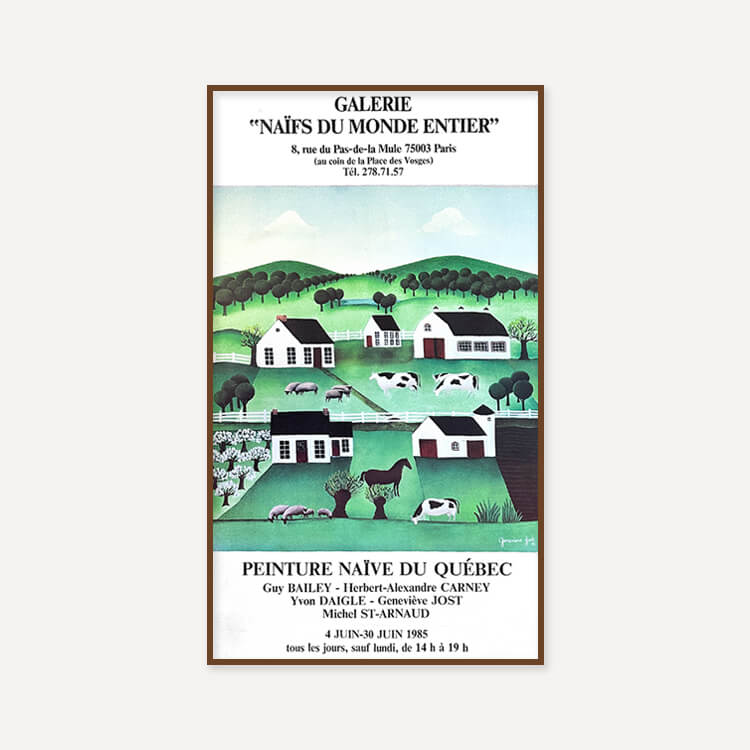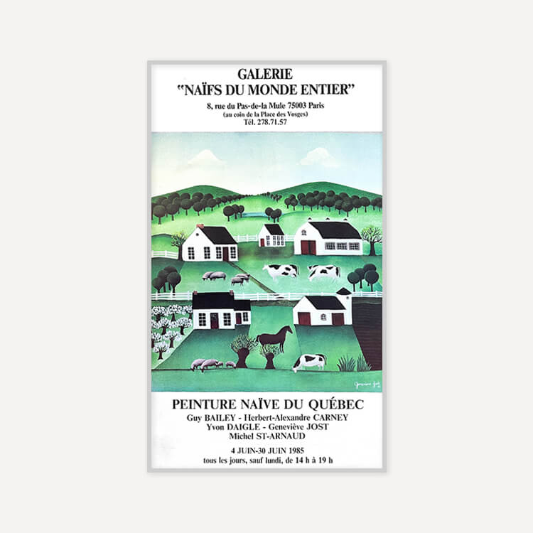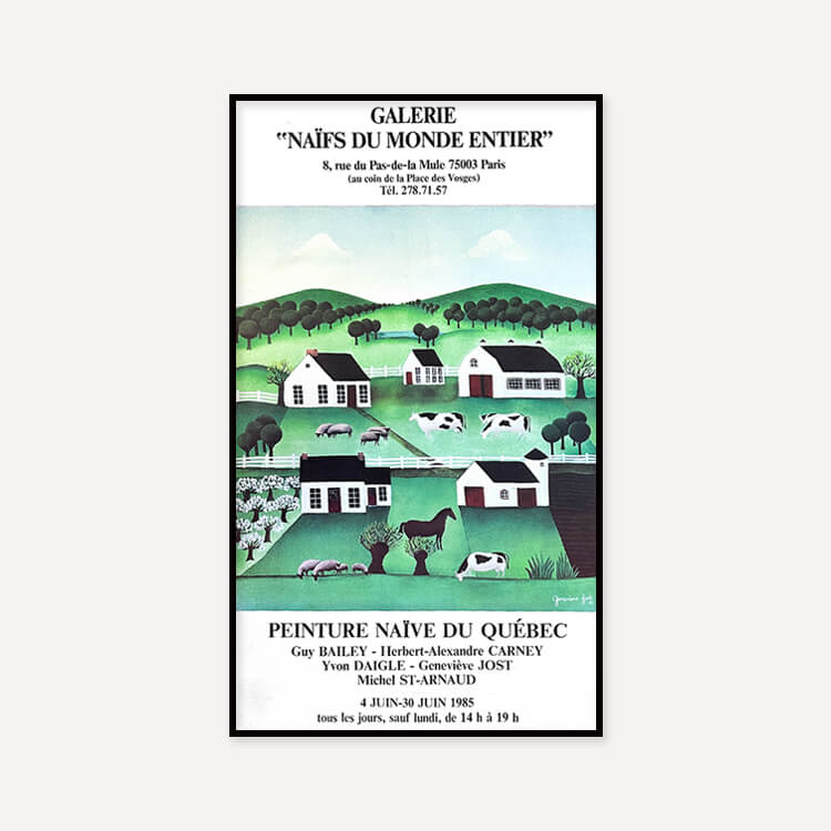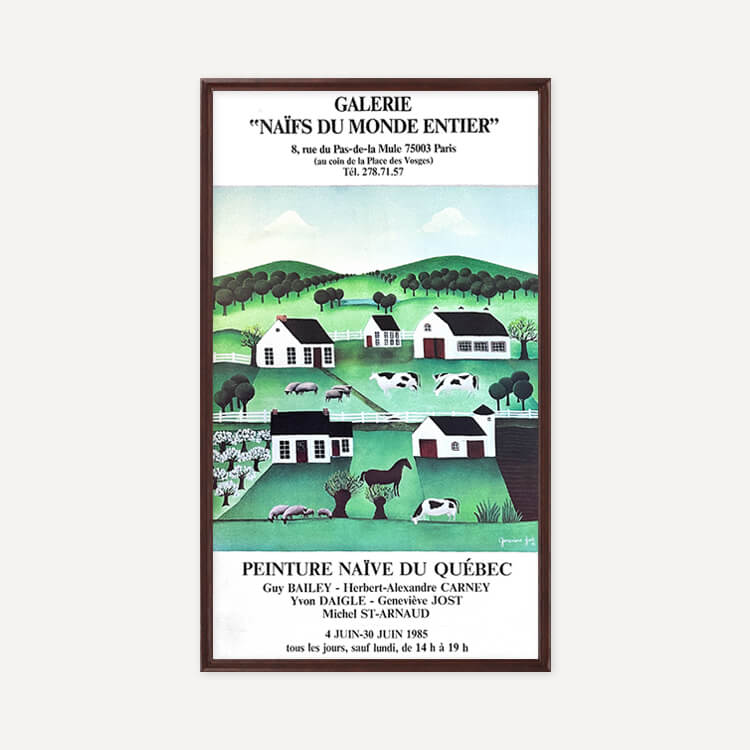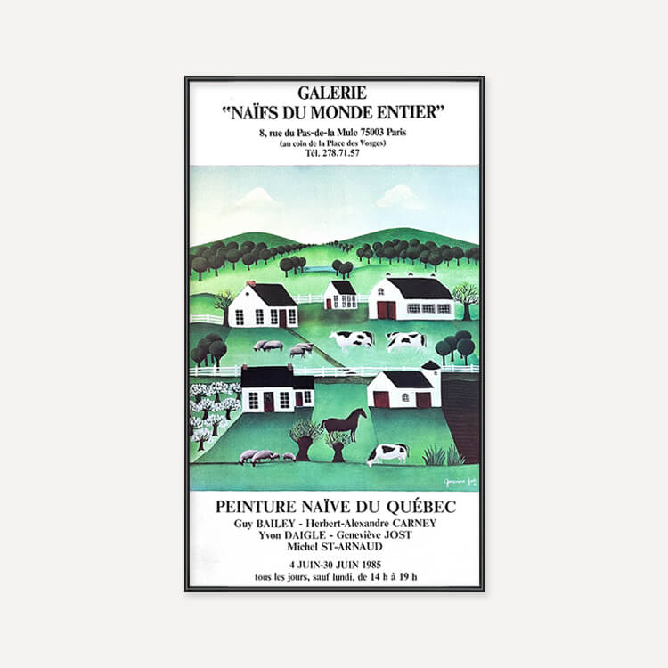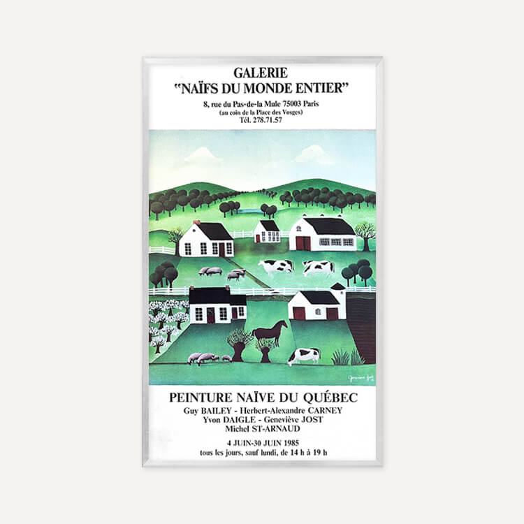 1985년 프랑스 파리 Naïfs du Monde entier 갤러리에서 열린 〈La peinture naïve du Québec à Paris〉 그룹 전시 포스터입니다. 현대 미술가 제네비에브 조스트(Geneviève Jost)의 작품을 모티브로 제작되었으며, 40년 이상 보존된 오리지널 빈티지 포스터입니다.