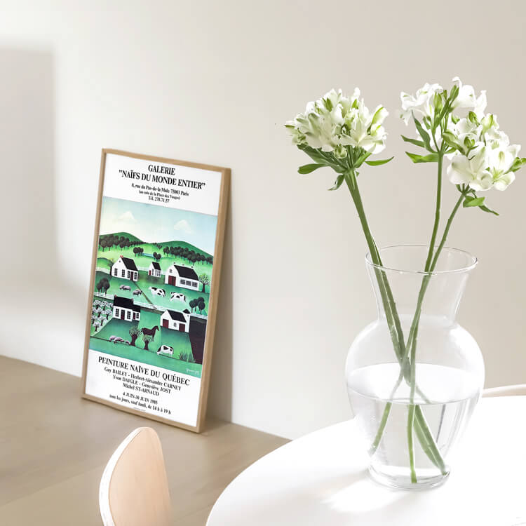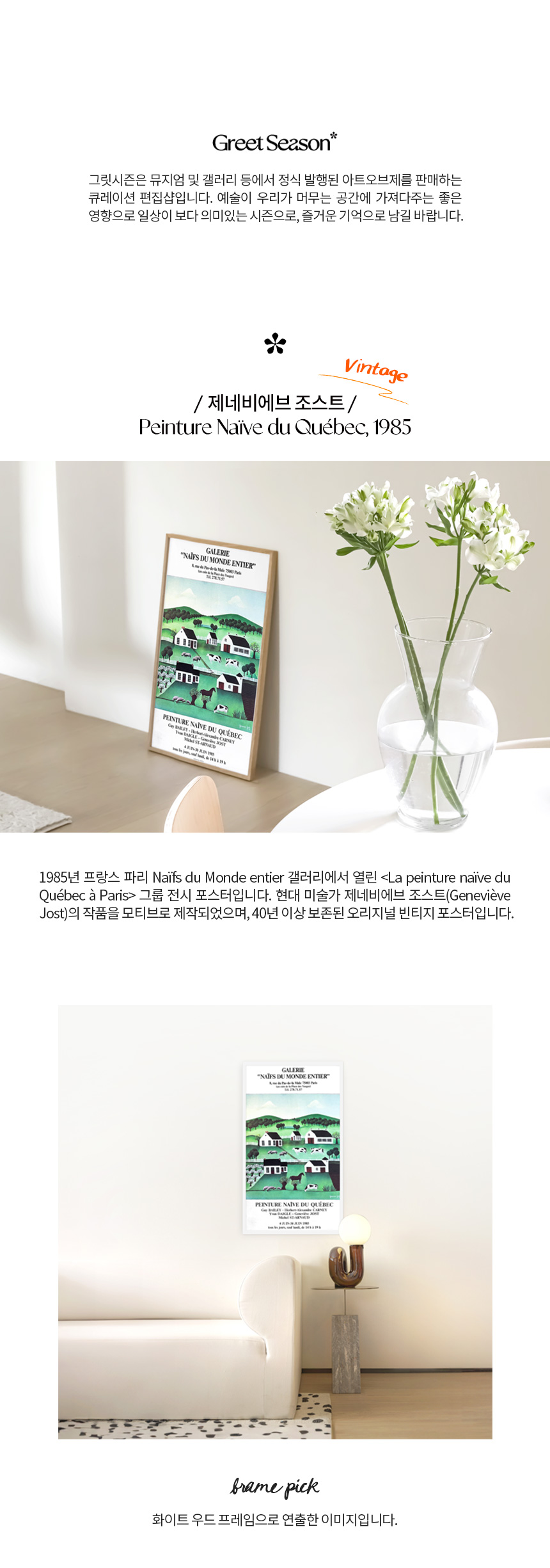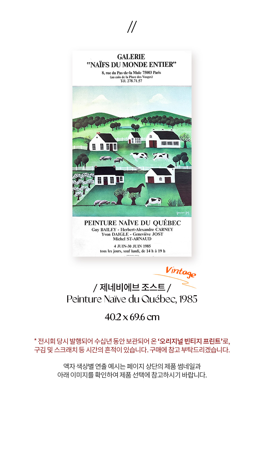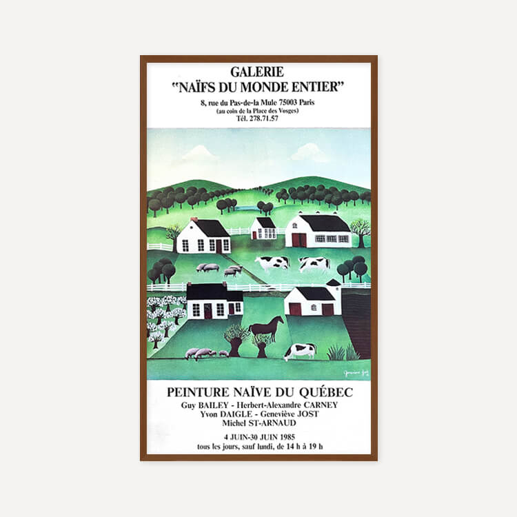 1985년 프랑스 파리 Naïfs du Monde entier 갤러리에서 열린 〈La peinture naïve du Québec à Paris〉 그룹 전시 포스터입니다. 현대 미술가 제네비에브 조스트(Geneviève Jost)의 작품을 모티브로 제작되었으며, 40년 이상 보존된 오리지널 빈티지 포스터입니다.