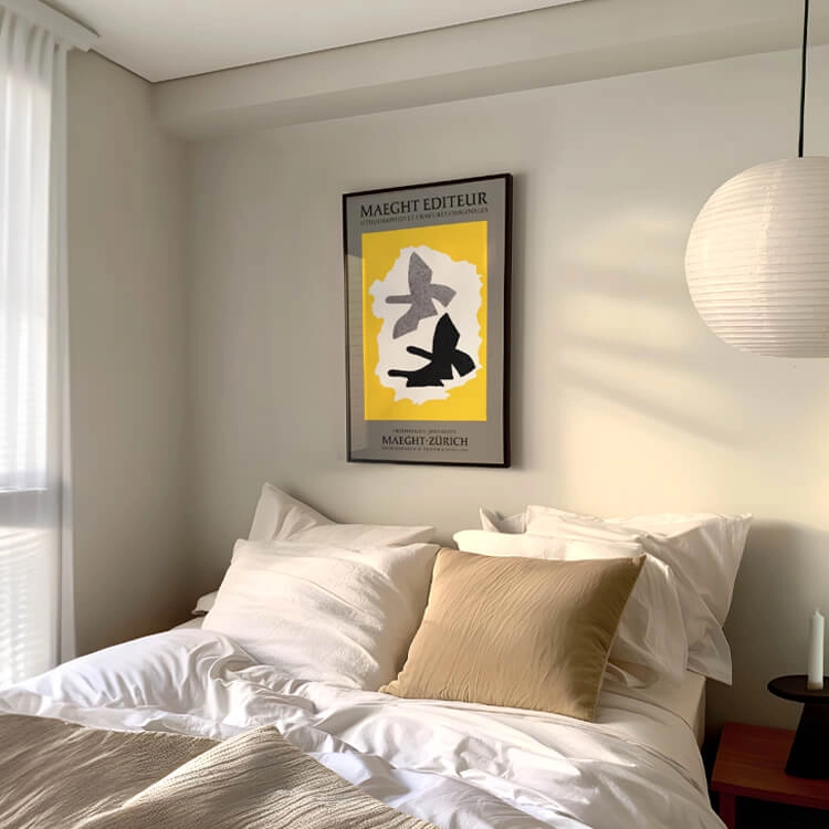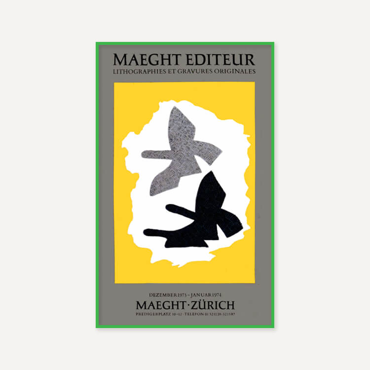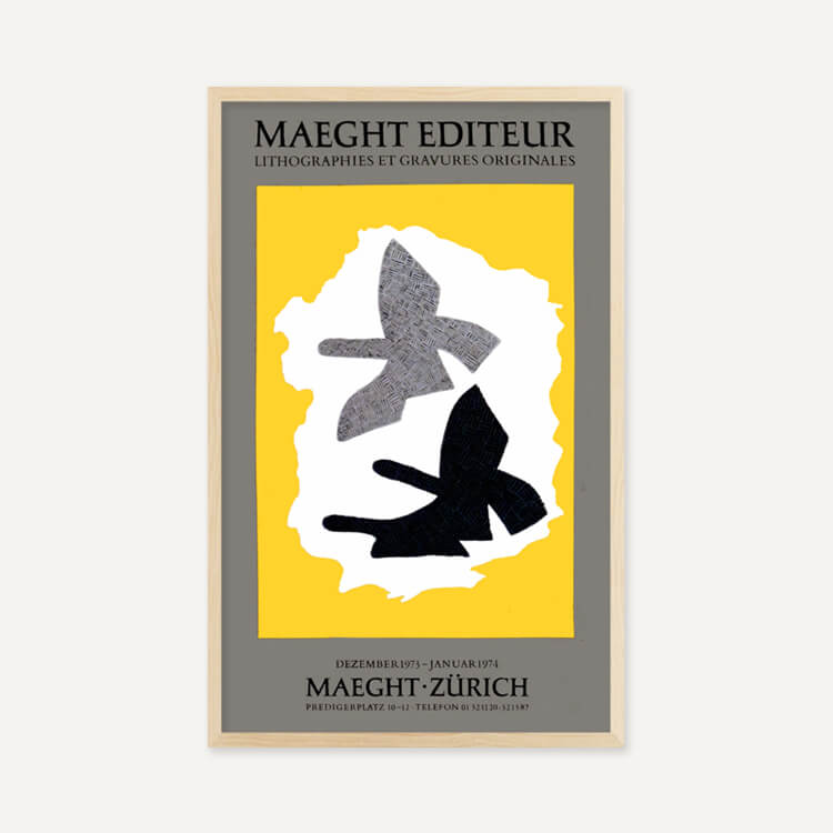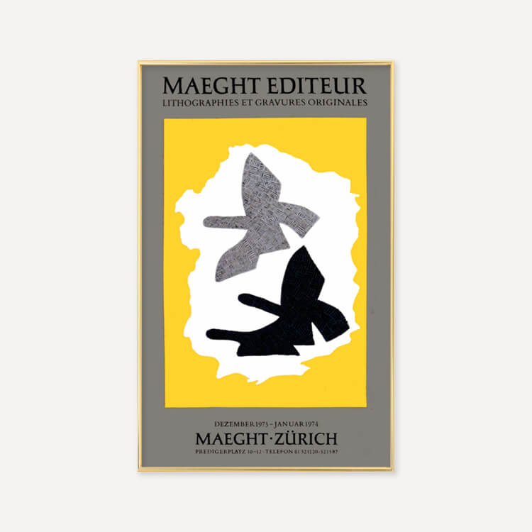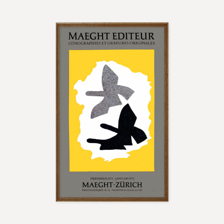 1973년 취리히에서 열린 조르주 브라크(Georges Braque) 전시회를 위해 프랑스 마그(Maeght) 미술관이 제작한 포스터로, 그의 작품 〈Three Birds in Flight〉가 담겨있습니다. 그는 20세기를 대표하는 프랑스의 위대한 예술가로서, 1905년부터 강렬한 색채의 포비즘 예술 운동을 이끌었으며, 큐비즘의 발전에 큰 공헌을 했습니다.