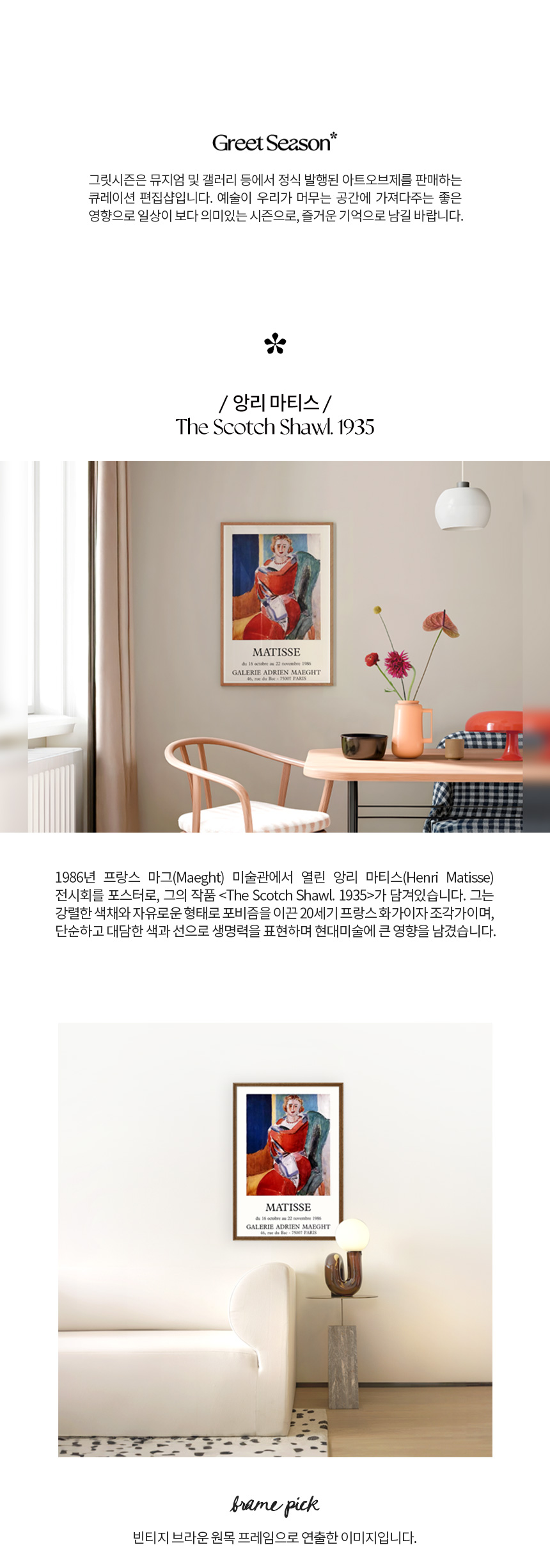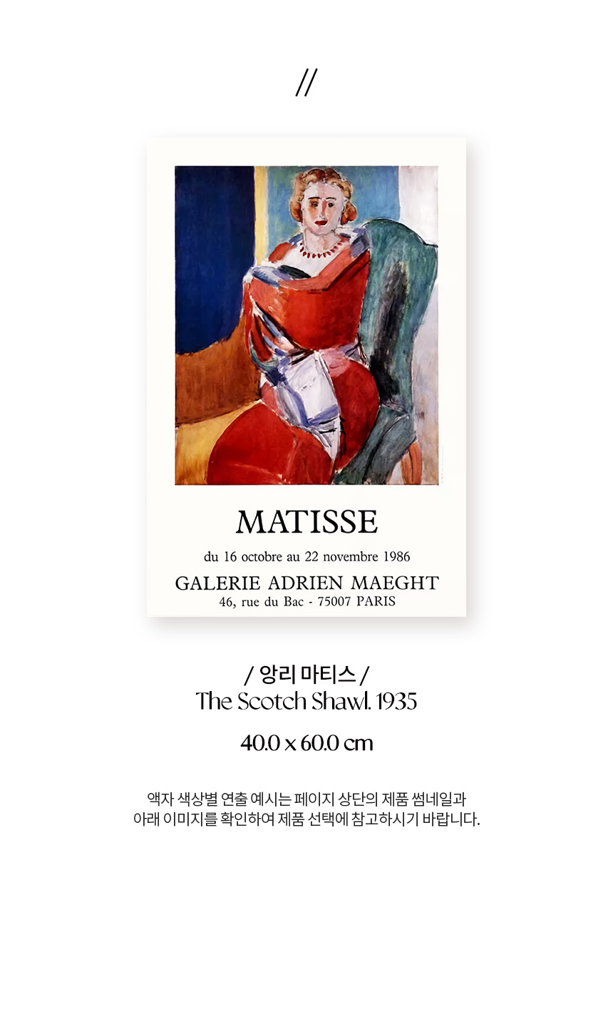 1986년 프랑스 마그(Maeght) 미술관에서 열린 앙리 마티스(Henri Matisse) 전시회를 포스터로, 그의 작품 〈The Scotch Shawl. 1935〉가 담겨있습니다. 그는 강렬한 색채와 자유로운 형태로 포비즘을 이끈 20세기 프랑스 화가이자 조각가이며, 단순하고 대담한 색과 선으로 생명력을 표현하며 현대미술에 큰 영향을 남겼습니다.