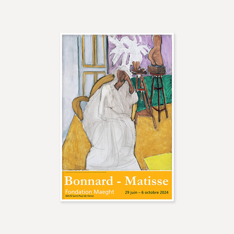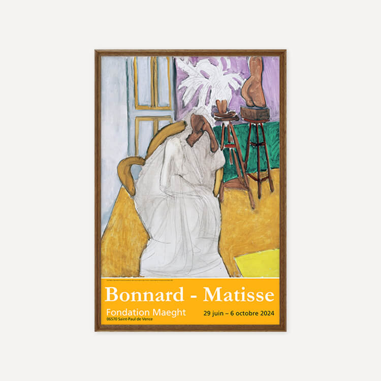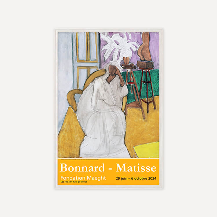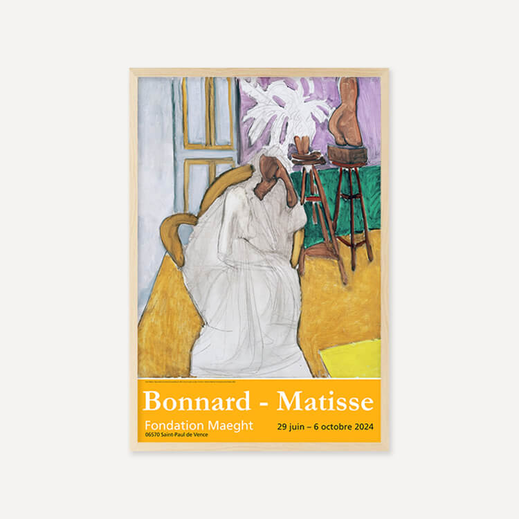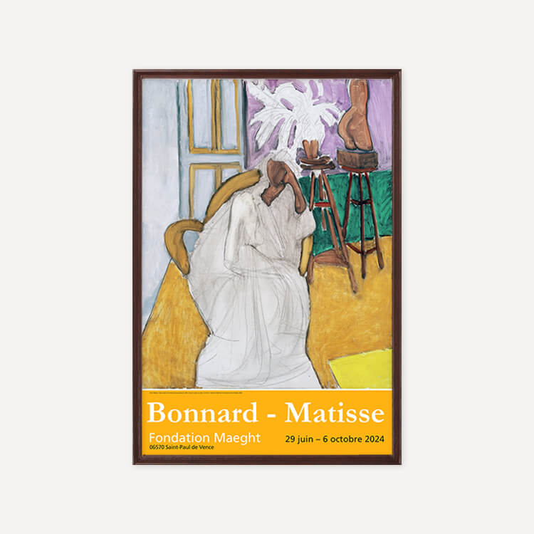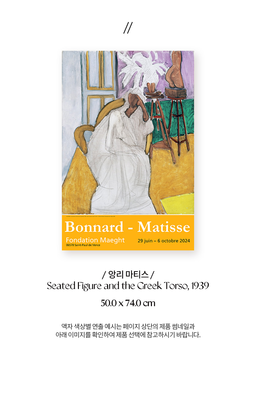 2024년 프랑스 마그(Maeght) 미술관에서 열린 〈Bonnard-Matisse〉 전시회 포스터에는 앙리 마티스(Henri Matisse)의 〈Seated Figure and the Greek Torso (La Gandoura), 1939〉가 담겨 있습니다. 그는 강렬한 색채와 자유로운 형태로 포비즘을 이끈 20세기 프랑스 화가이자 조각가로, 단순하고 대담한 색과 선으로 생명력을 표현하며 현대미술에 큰 영향을 남겼습니다.