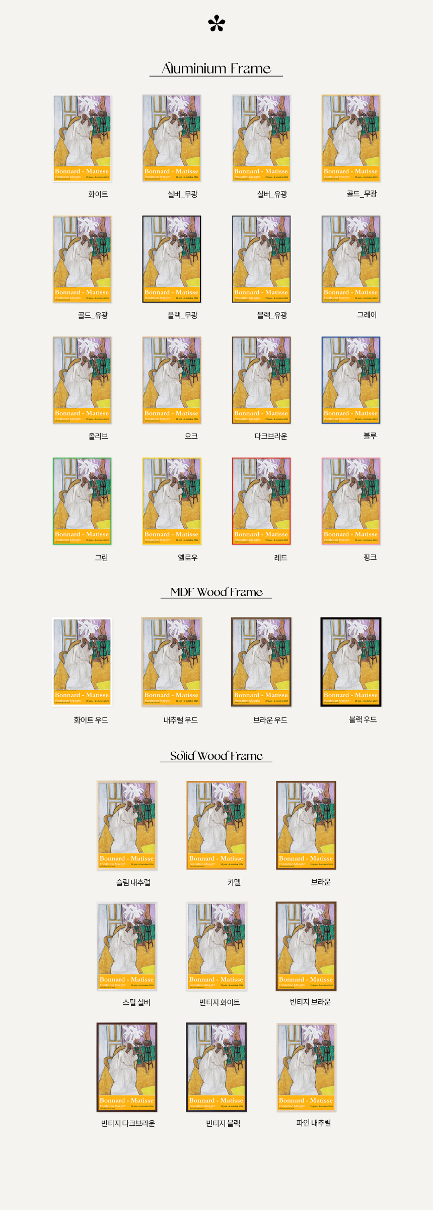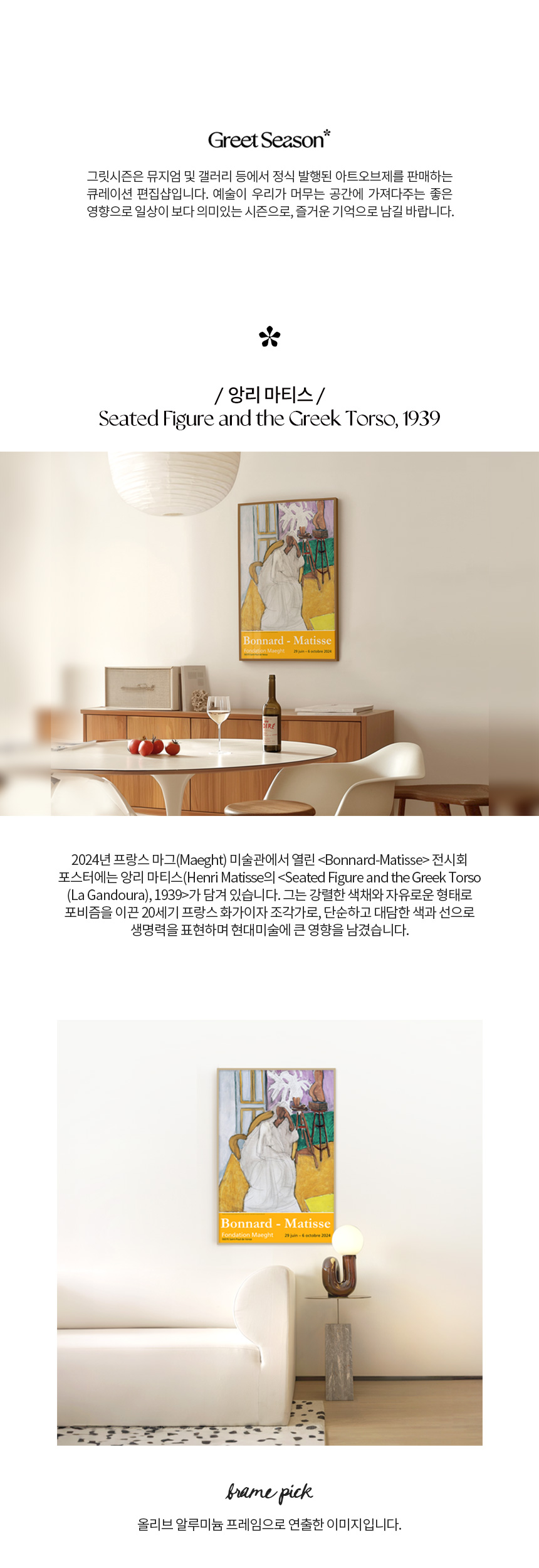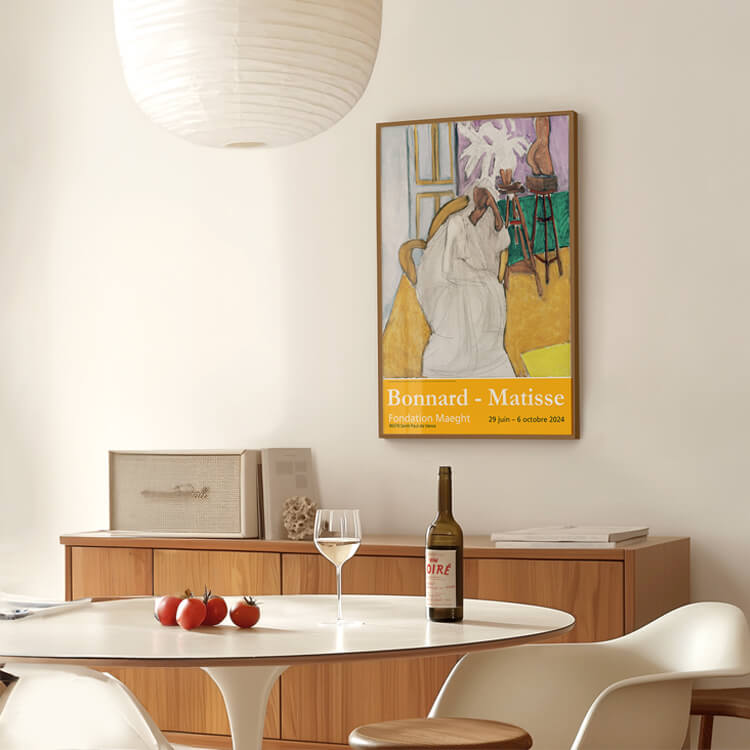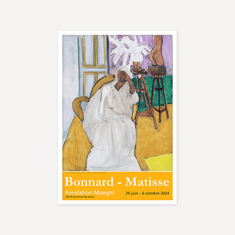 2024년 프랑스 마그(Maeght) 미술관에서 열린 〈Bonnard-Matisse〉 전시회 포스터에는 앙리 마티스(Henri Matisse)의 〈Seated Figure and the Greek Torso (La Gandoura), 1939〉가 담겨 있습니다. 그는 강렬한 색채와 자유로운 형태로 포비즘을 이끈 20세기 프랑스 화가이자 조각가로, 단순하고 대담한 색과 선으로 생명력을 표현하며 현대미술에 큰 영향을 남겼습니다.