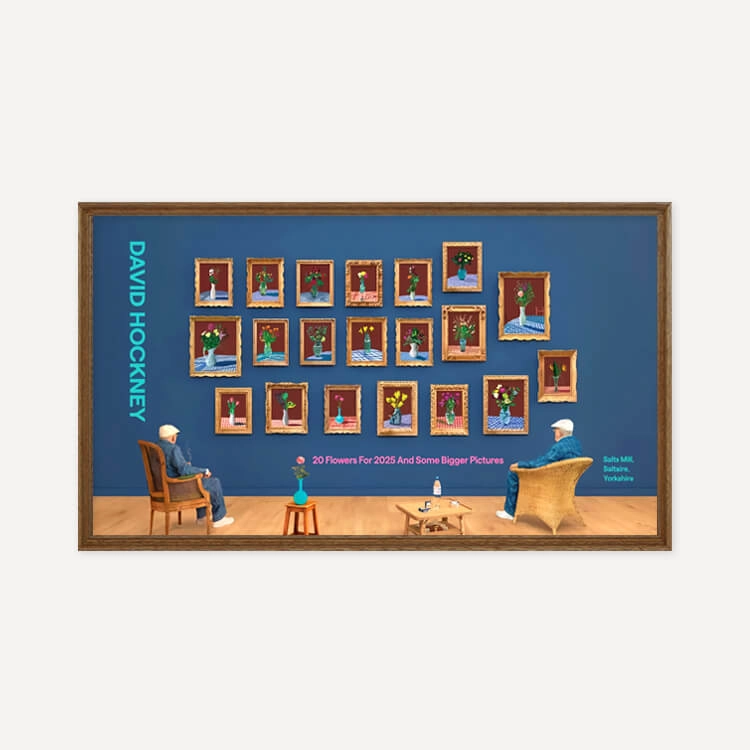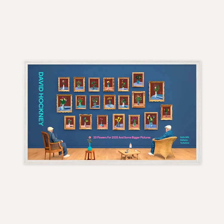 2025년 브래드퍼드의 영국 문화도시 지정을 기념해 영국 솔츠밀(Salts Mill)에서 열린 전시 〈20 Flowers For 2025 And Some Bigger Pictures〉를 위해 제작된 포스터로, 데이비드 호크니(David Hockney)의 〈25th June 2022, Looking at the Flowers (Framed)〉를 담고 있습니다. 두 명의 호크니가 20송이 꽃을 바라보며 앉아 있는 이 작품은, 3D 촬영과 컴퓨터 합성을 활용한 ‘포토그래픽 드로잉’ 기법으로, 호크니가 새로운 형태의 사진이라 부르는 실험적 작업입니다.