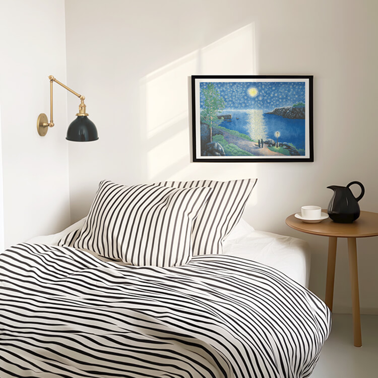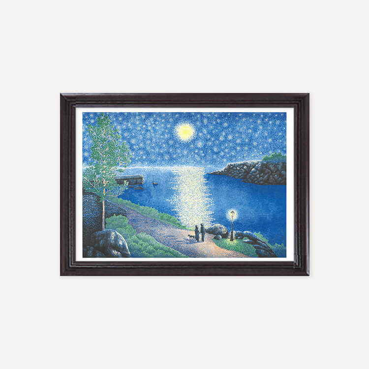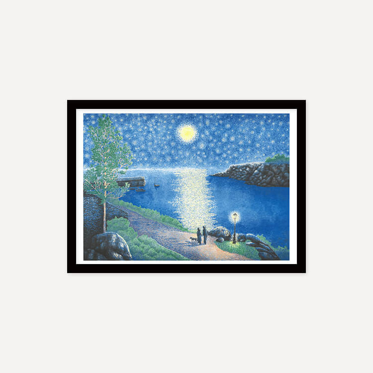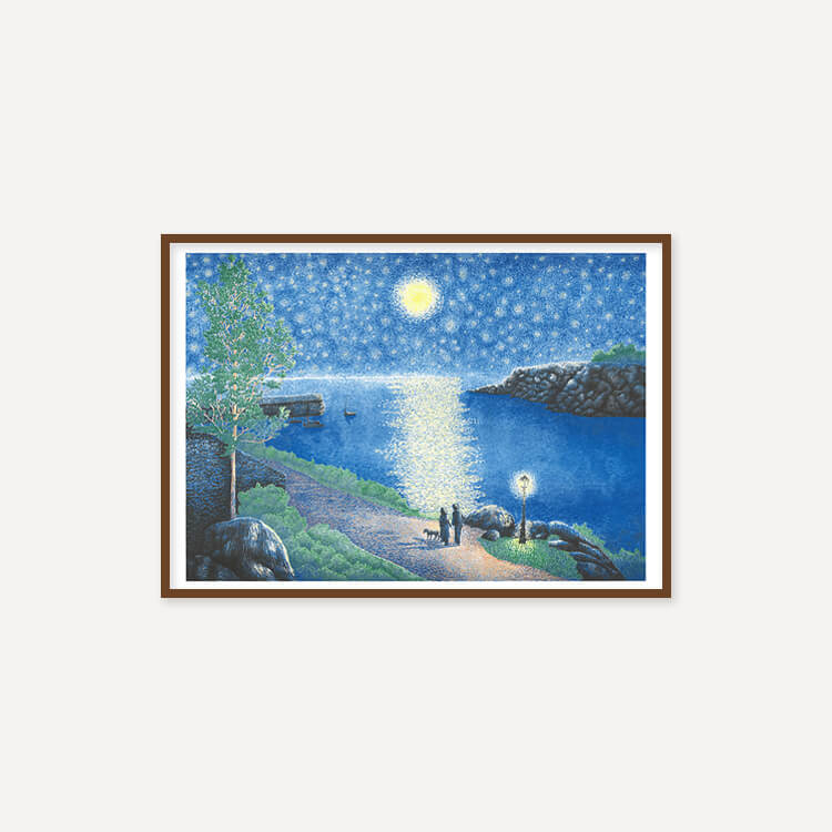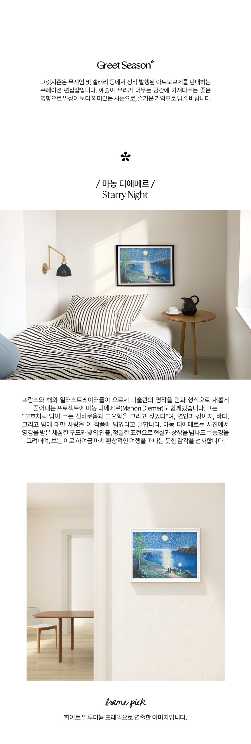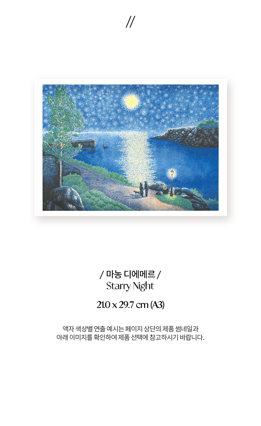 프랑스와 해외 일러스트레이터들이 오르세 미술관의 명작을 만화 형식으로 새롭게 풀어내는 프로젝트에 마농 디에메르(Manon Diemer)도 함께했습니다. 그는 “고흐처럼 밤이 주는 신비로움과 고요함을 그리고 싶었다”며, 연인과 강아지, 바다, 그리고 밤에 대한 사랑을 이 작품에 담았다고 말합니다. 마농 디에메르는 사진에서 영감을 받은 세심한 구도와 빛의 연출, 정밀한 표현으로 현실과 상상을 넘나드는 풍경을 그려내며, 보는 이로 하여금 마치 환상적인 여행을 떠나는 듯한 감각을 선사합니다.