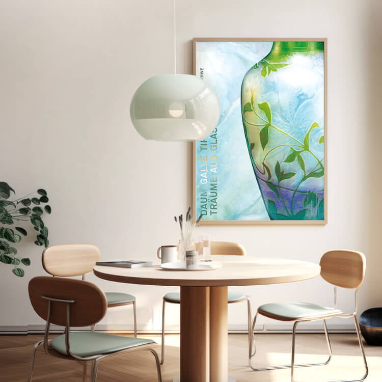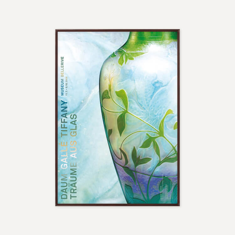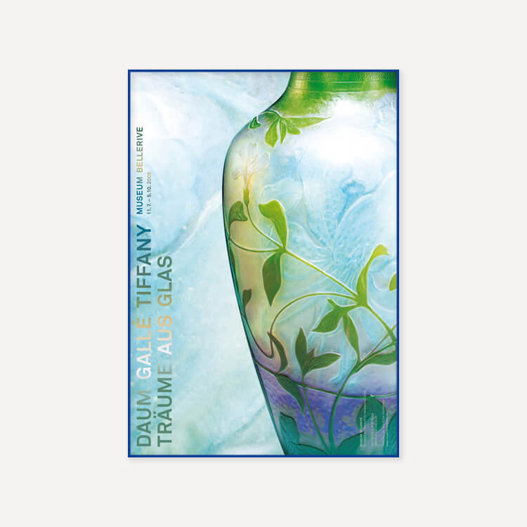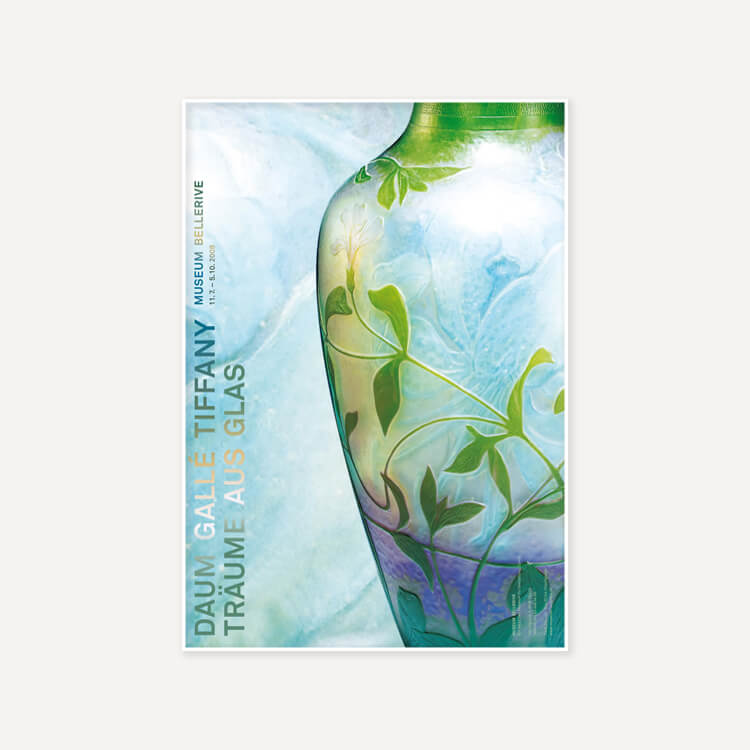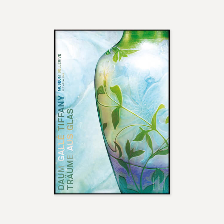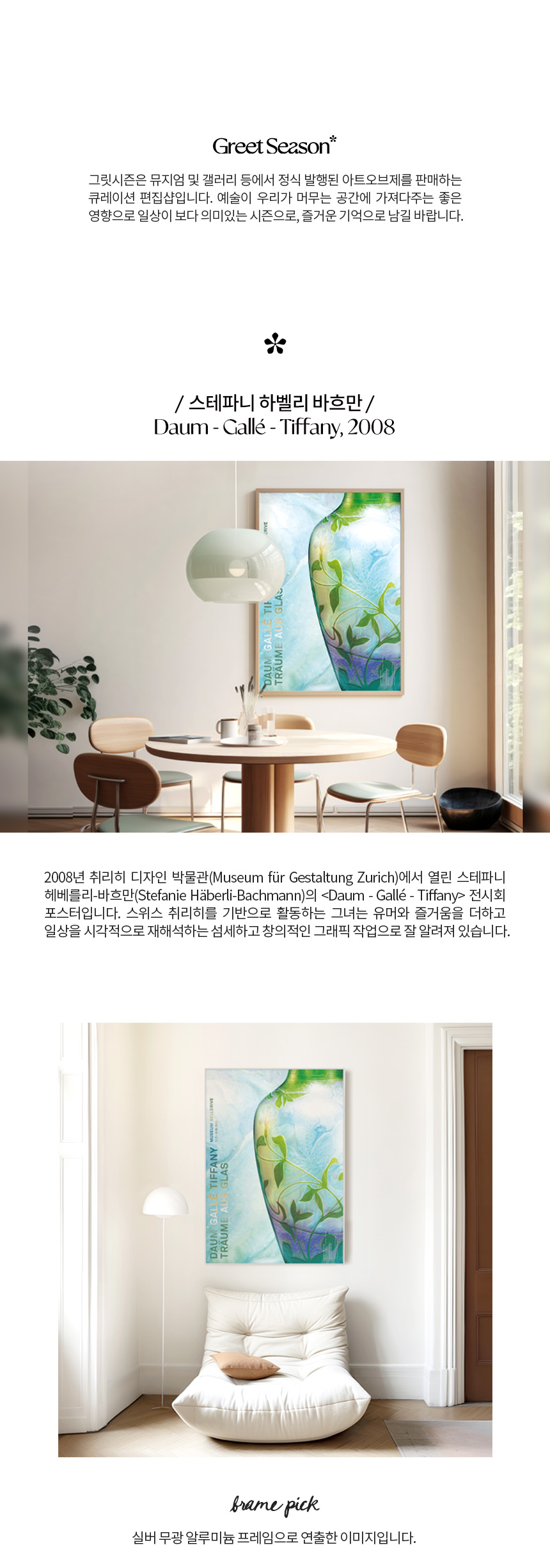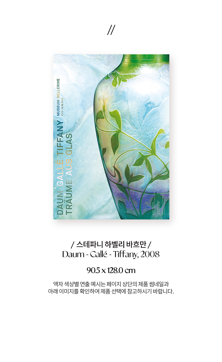 2008년 취리히 디자인 박물관(Museum für Gestaltung Zurich)에서 열린 스테파니 헤베를리-바흐만(Stefanie Häberli-Bachmann)의 <Daum - Gallé - Tiffany> 전시회 포스터입니다. 스위스 취리히를 기반으로 활동하는 그녀는 유머와 즐거움을 더하고 일상을 시각적으로 재해석하는 섬세하고 창의적인 그래픽 작업으로 잘 알려져 있습니다.