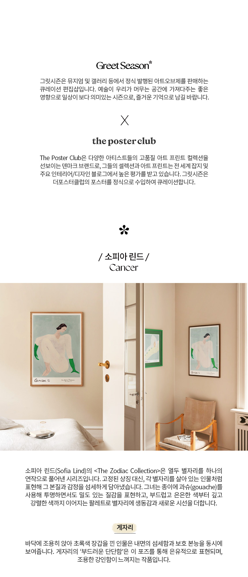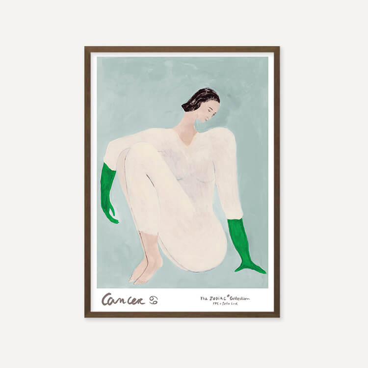 바닥에 조용히 앉아 초록색 장갑을 낀 인물은 내면의 섬세함과 보호 본능을 동시에 보여줍니다. 게자리의 ‘부드러운 단단함’은 이 포즈를 통해 은유적으로 표현되며, 조용한 강인함이 느껴지는 작품입니다.