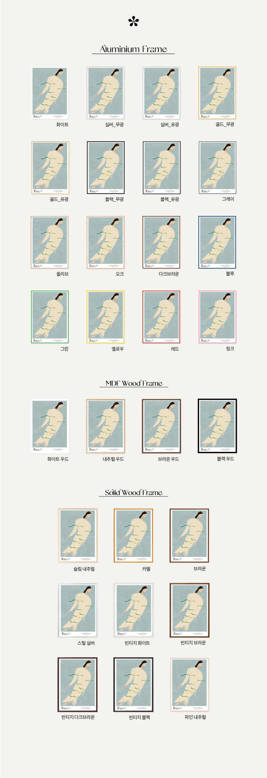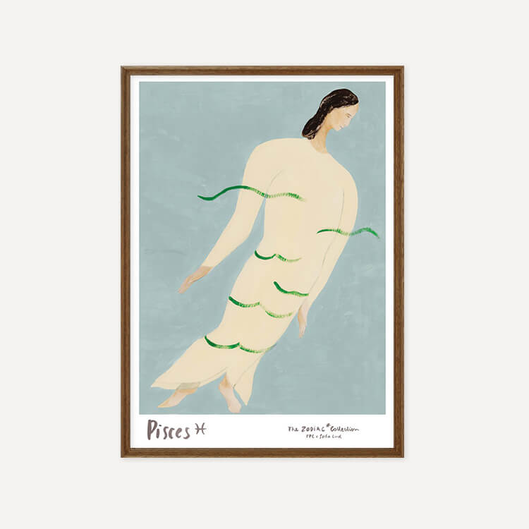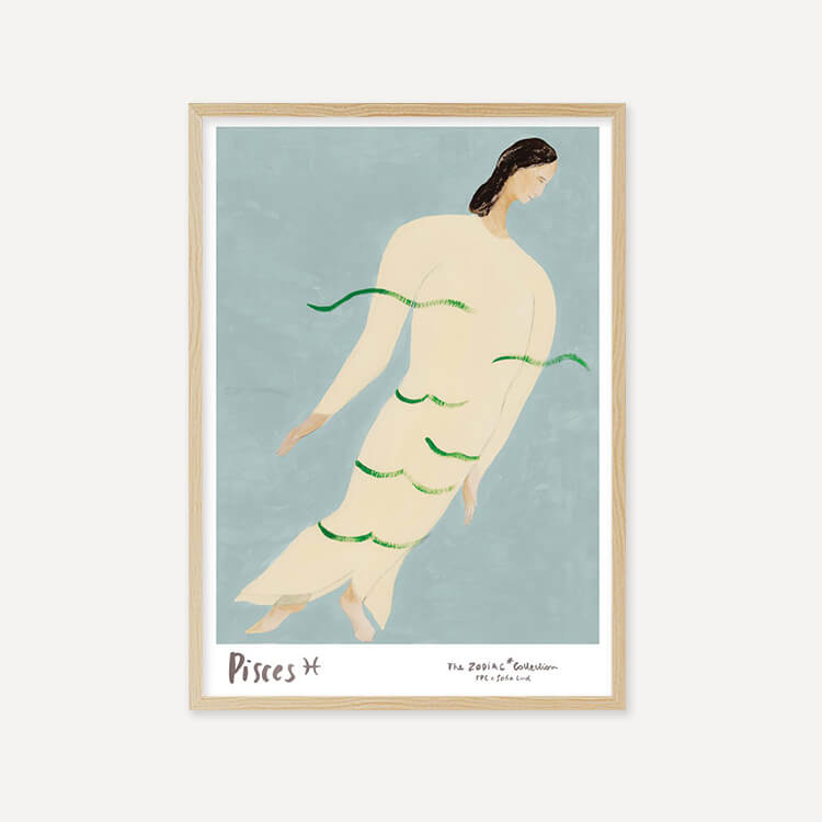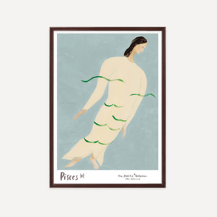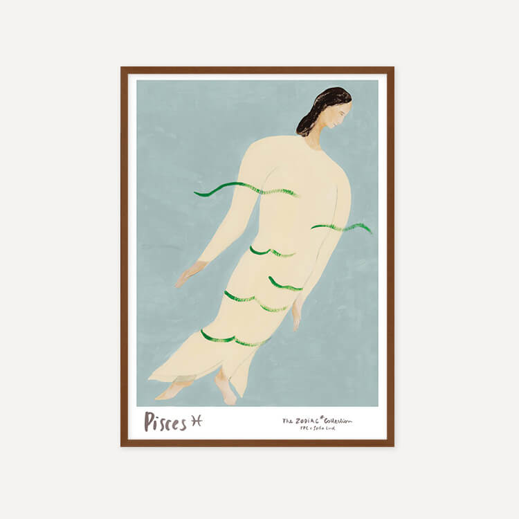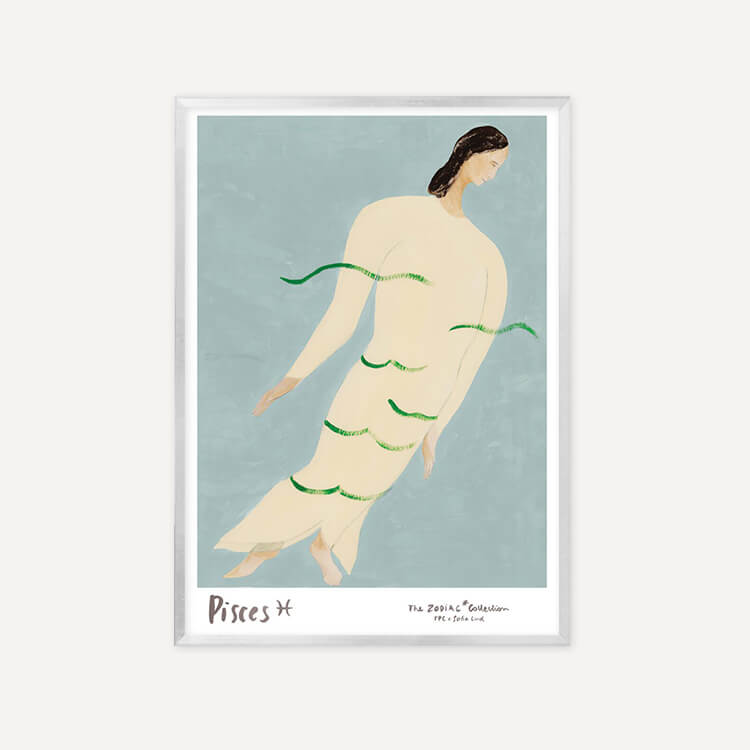 잔잔한 물결에 실려 흐르는 듯한 인물은 몽환적인 분위기 속에서도 중심을 잃지 않는 물고기자리의 직관을 상징합니다. 부드러운 곡선과 여유로운 자세는 깊은 감성과 조용한 내면의 힘을 담고 있습니다.