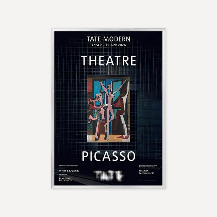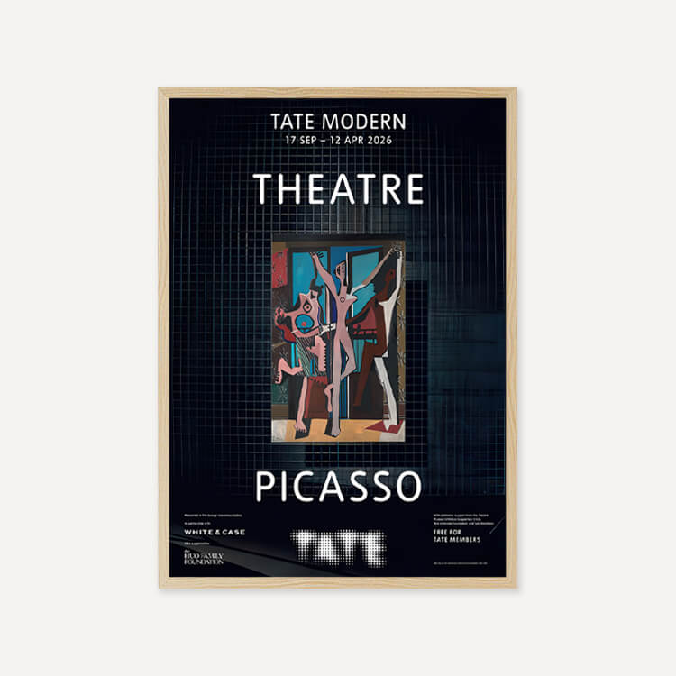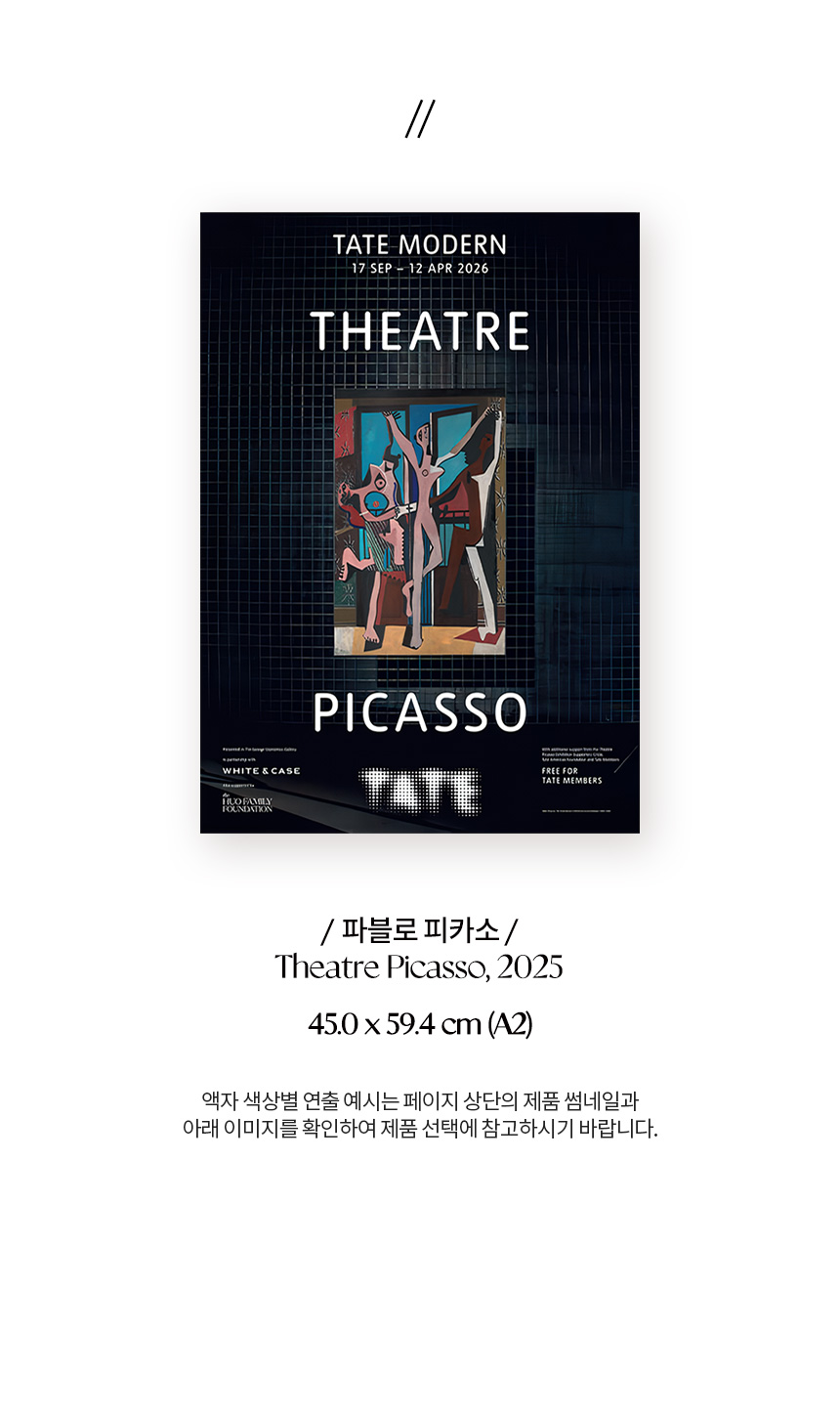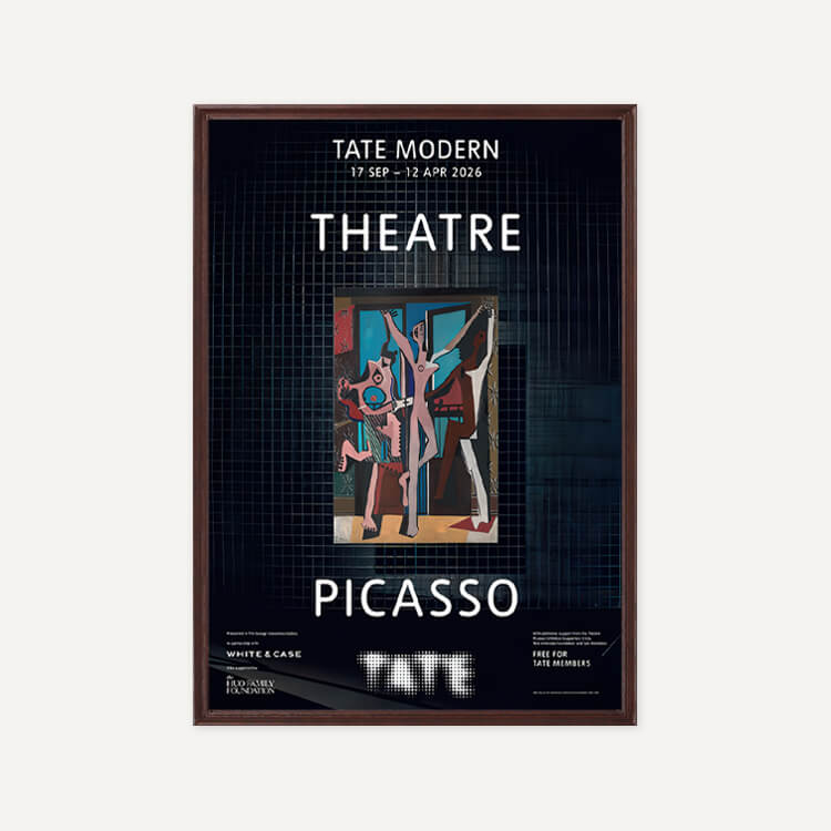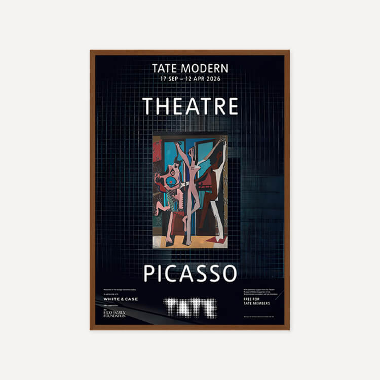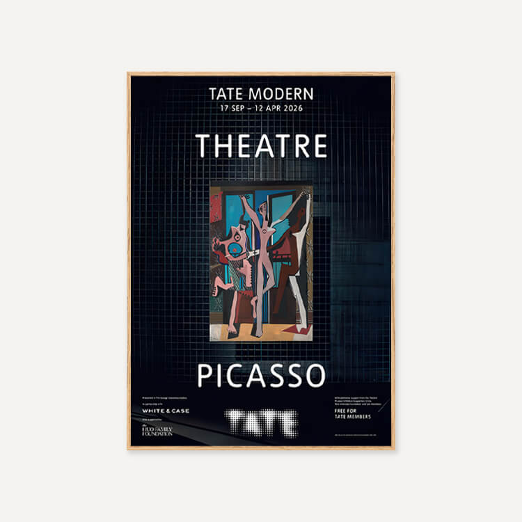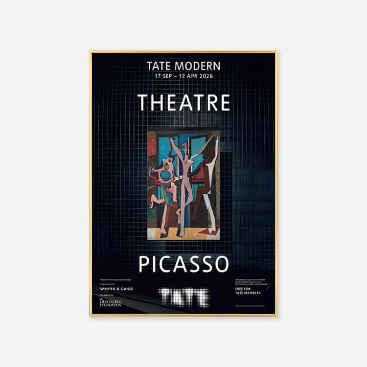 파블로 피카소(Pablo Picasso)의 걸작 <세 명의 무용수(The Three Dancers)> 탄생 100주년을 기념하여 2025년 영국 테이트 모던(Tate Modern) 갤러리 〈Theatre Picasso〉 전시회의 공식 포스터입니다. 이 전시는 갤러리 공간을 하나의 극장으로 탈바꿈시켜 피카소의 예술 세계를 입체적으로 조명했습니다. 영국에서 최초로 선보이는 작품들을 포함해 회화, 조각, 텍스타일 등 매체를 넘나드는 작가의 역동적인 창의성을 담아낸 전시의 기록입니다.