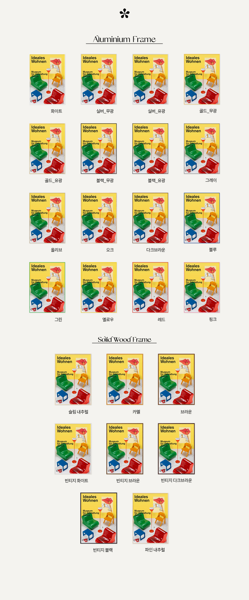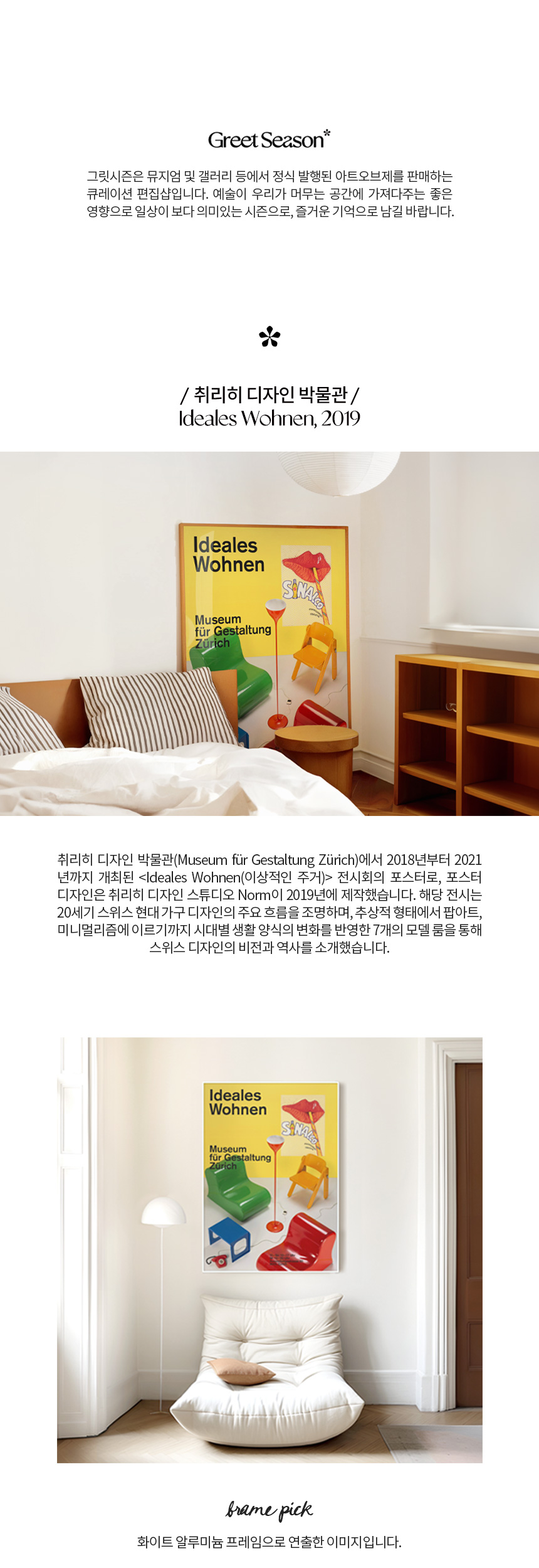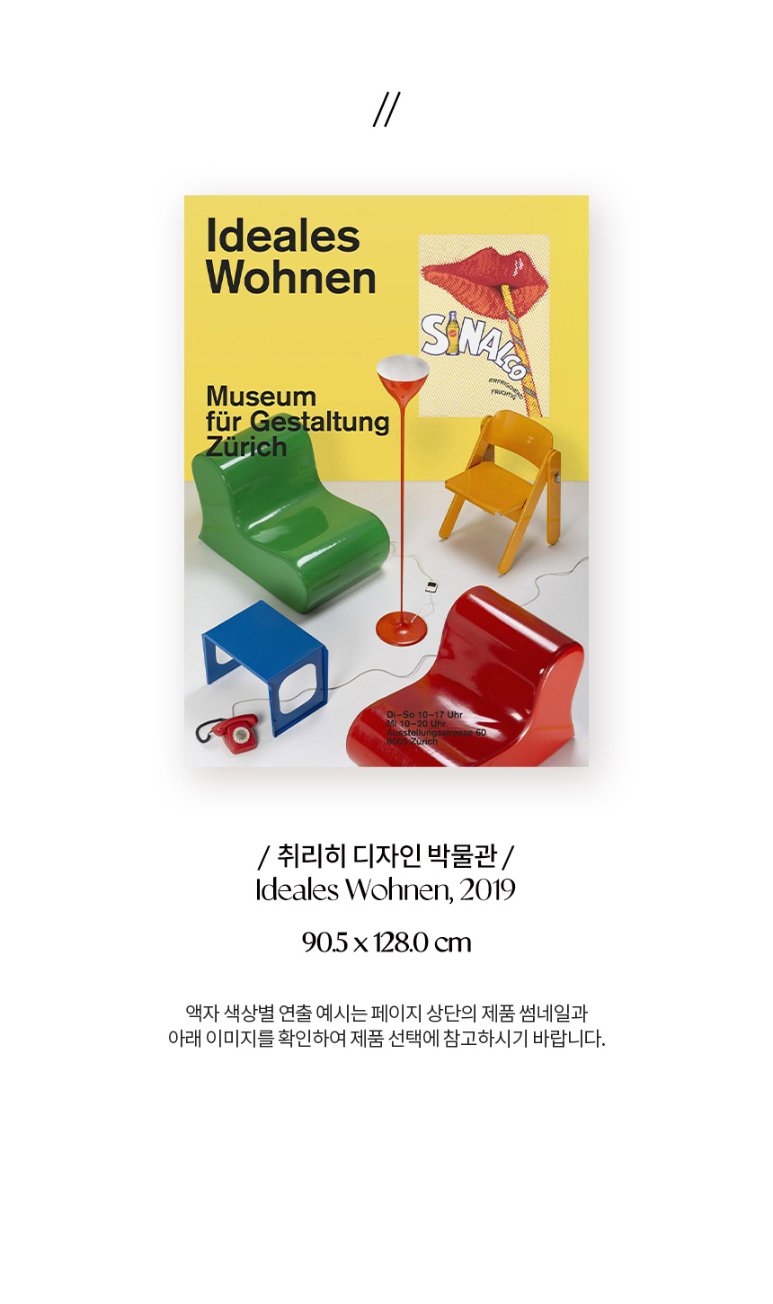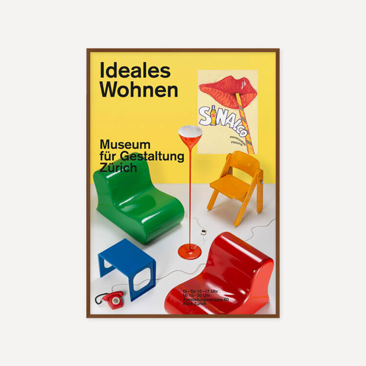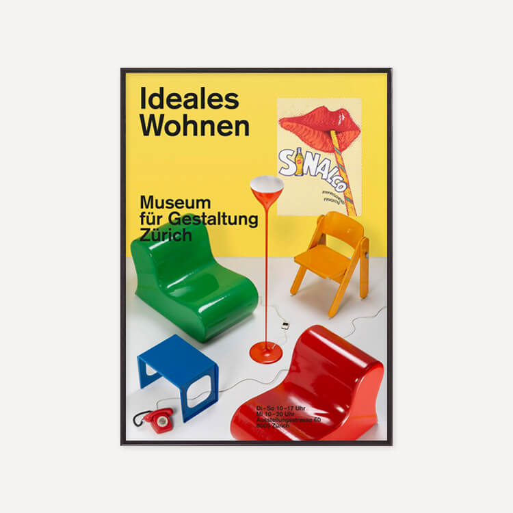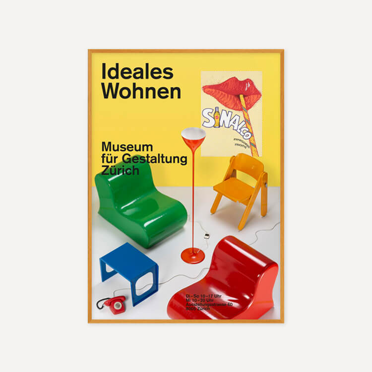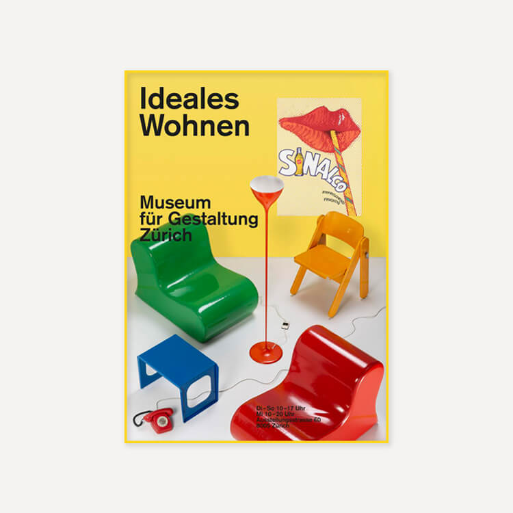 취리히 디자인 박물관(Museum für Gestaltung Zürich)에서 2018년부터 2021년까지 개최된 〈Ideales Wohnen(이상적인 주거)〉 전시회의 포스터로, 포스터 디자인은 취리히 디자인 스튜디오 Norm이 2019년에 제작했습니다. 해당 전시는 20세기 스위스 현대 가구 디자인의 주요 흐름을 조명하며, 추상적 형태에서 팝아트, 미니멀리즘에 이르기까지 시대별 생활 양식의 변화를 반영한 7개의 모델 룸을 통해 스위스 디자인의 비전과 역사를 소개했습니다.