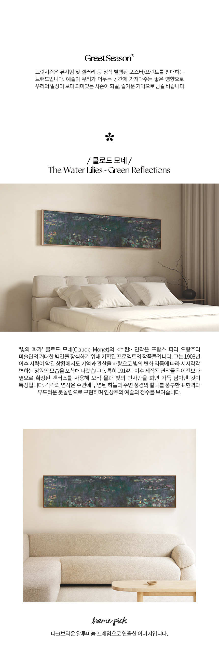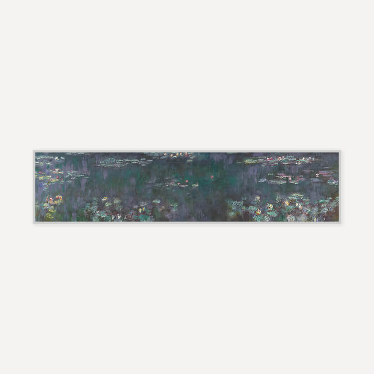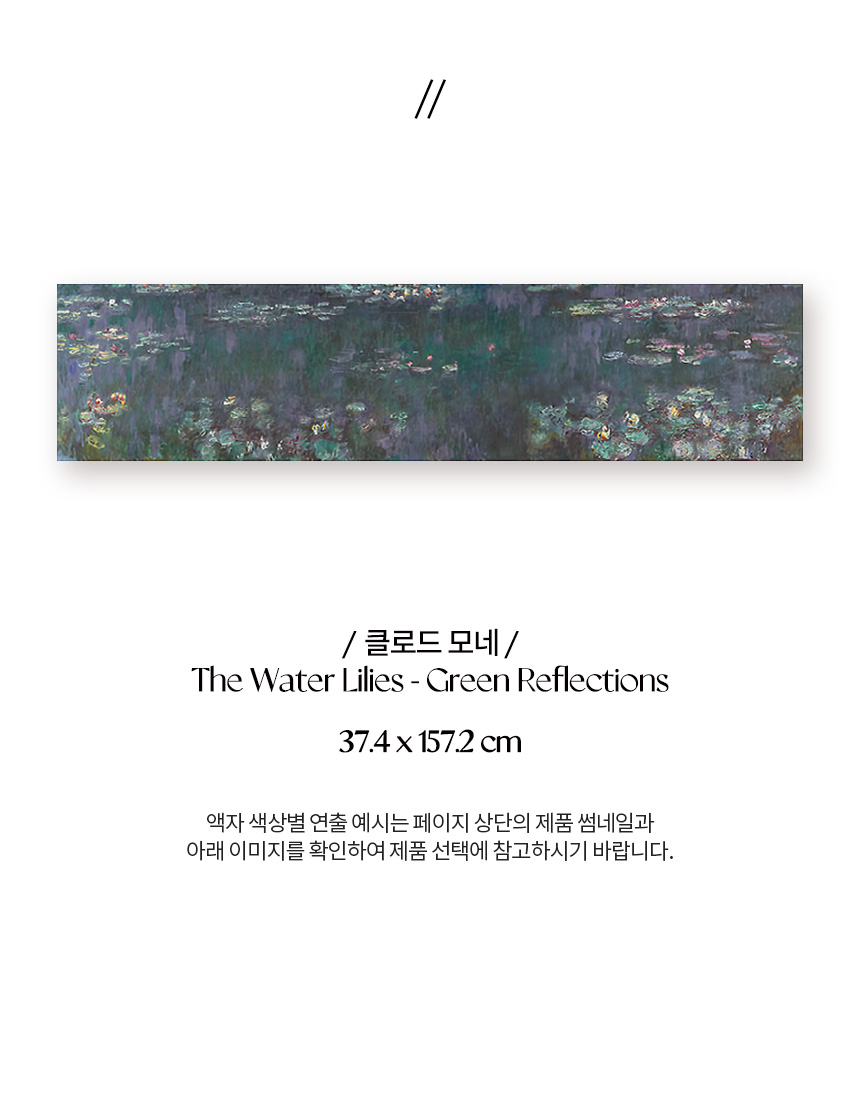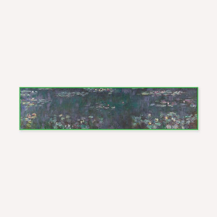'빛의 화가' 클로드 모네(Claude Monet)의 〈수련〉 연작은 프랑스 파리 오랑주리 미술관의 거대한 벽면을 장식하기 위해 기획된 프로젝트의 작품들입니다. 그는 1908년 이후 시력이 악된 상황에서도 기억과 관찰을 바탕으로 빛의 변화 리듬에 따라 시시각각 변하는 정원의 모습을 포착해 나갔습니다. 특히 1914년 이후 제작된 연작들은 이전보다 옆으로 확장된 캔버스를 사용해 오직 물과 빛의 반사만을 화면 가득 담아낸 것이 특징입니다. 각각의 연작은 수면에 투영된 하늘과 주변 풍경의 찰나를 풍부한 표현력과 부드러운 붓놀림으로 구현하며 인상주의 예술의 정수를 보여줍니다.