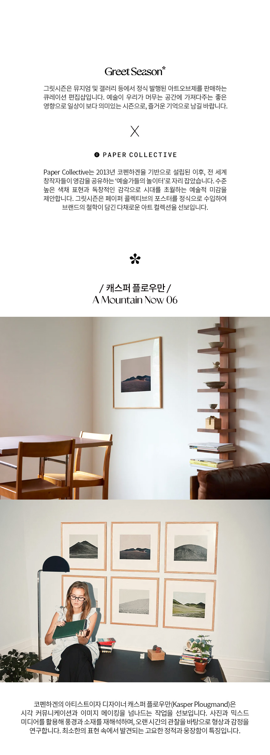 코펜하겐의 아티스트이자 디자이너 캐스퍼 플로우만(Kasper Plougmand)은 시각 커뮤니케이션과 이미지 메이킹을 넘나드는 작업을 선보입니다. 사진과 믹스드 미디어를 활용해 풍경과 소재를 재해석하며, 오랜 시간의 관찰을 바탕으로 형상과 감정을 연구합니다. 최소한의 표현 속에서 발견되는 고요한 정적과 웅장함이 특징입니다.