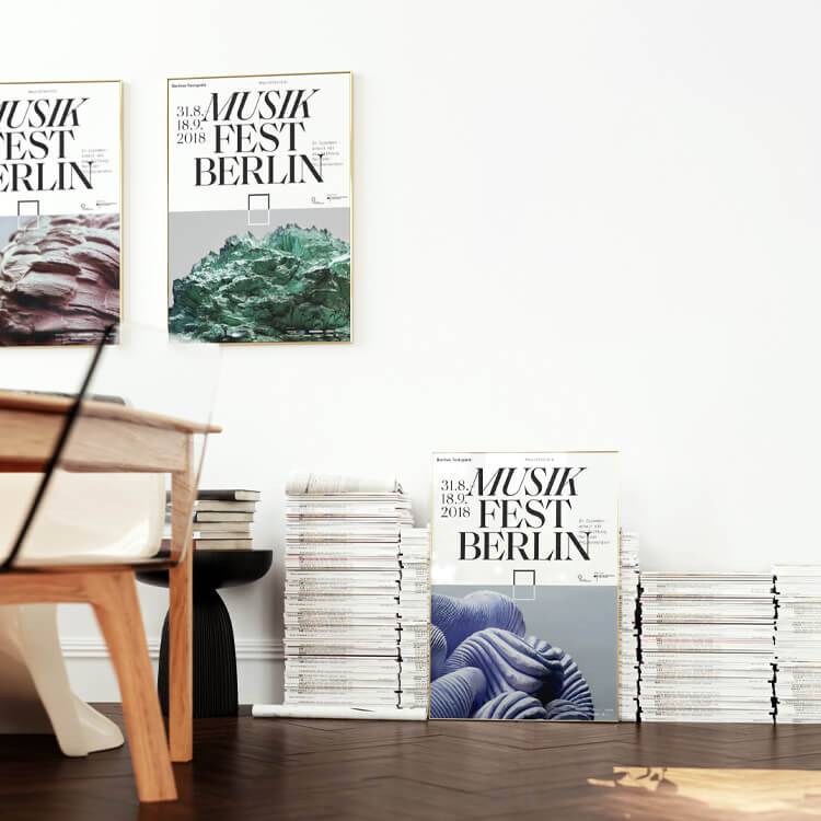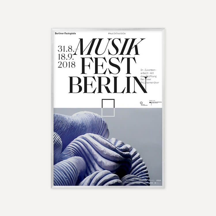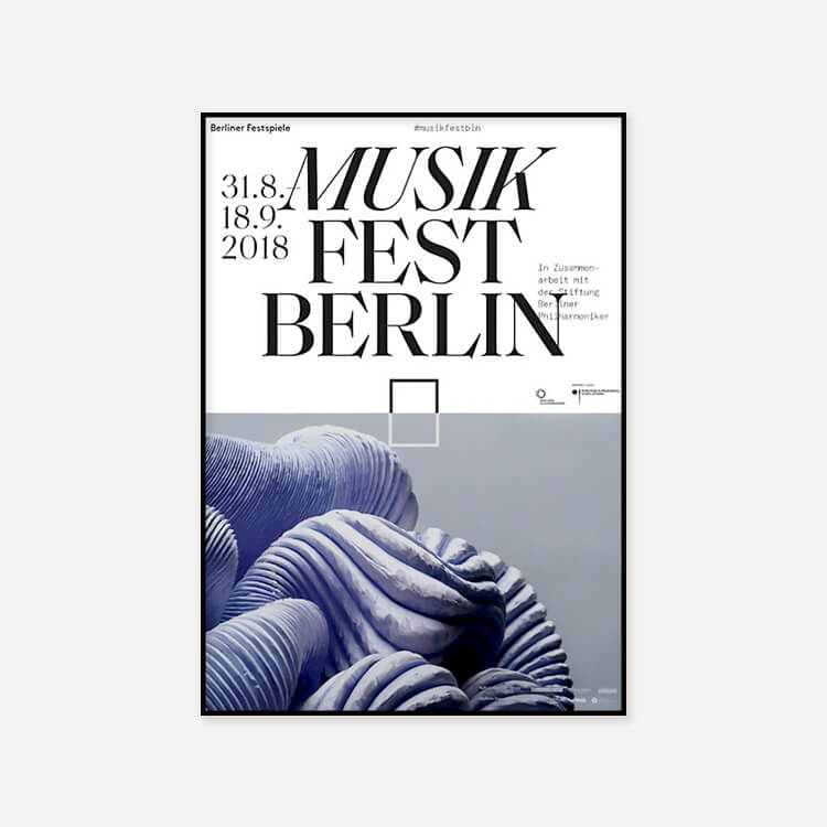 클래식과 현대 음악 분야의 주요 오케스트라와 앙상블의 혁신적인 예술 작품을 위한 포럼 〈베를린 뮤직페스트 2018(Musikfest Berlin 2018)〉의 포스터로, 코발트 블루 추상 모티브가 디자인되어 있습니다.