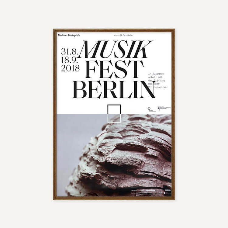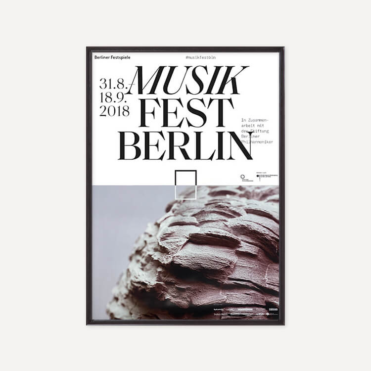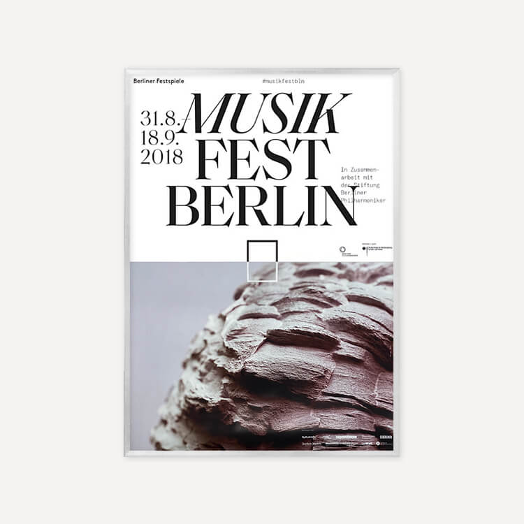 클래식과 현대 음악 분야의 주요 오케스트라와 앙상블의 혁신적인 예술 작품을 위한 포럼 〈베를린 뮤직페스트 2018(Musikfest Berlin 2018)〉의 포스터로, 샌드 브라운 추상 모티브가 디자인되어 있습니다.
