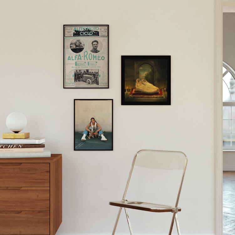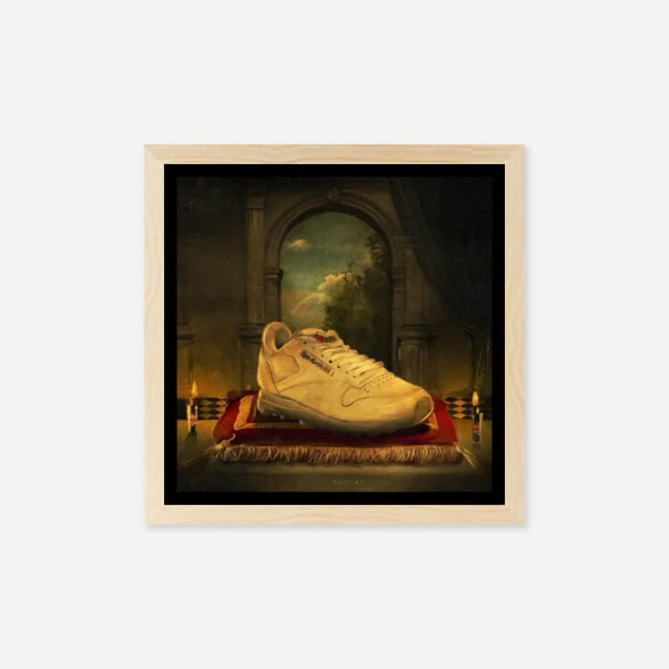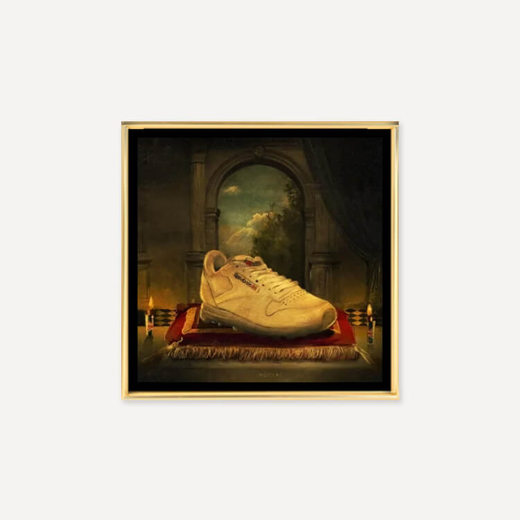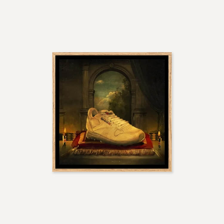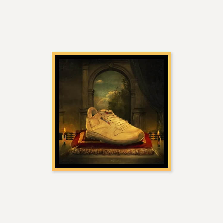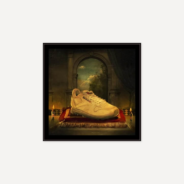 루벤 댄구어(Reuben Dangoor)는 현대인과 오브제를 활용한 디지털 뉴에이지 스타일의 영국 디자이너로, 이 프린트는 운동화 문화에 큰 영향을 준 전설적인 운동화에 경의를 표하는 ‘Holy Trainerity’ 시리즈 중 하나입니다.