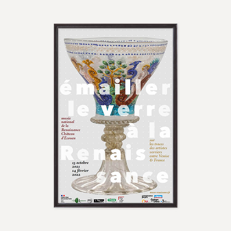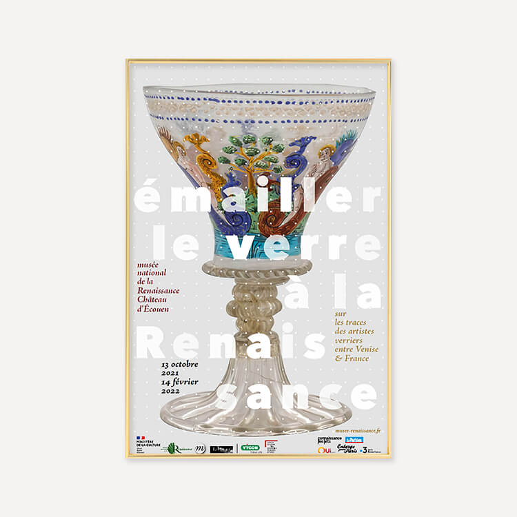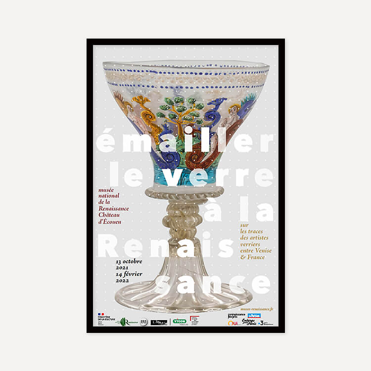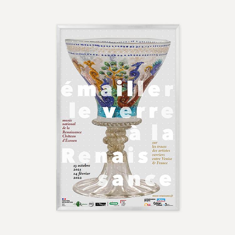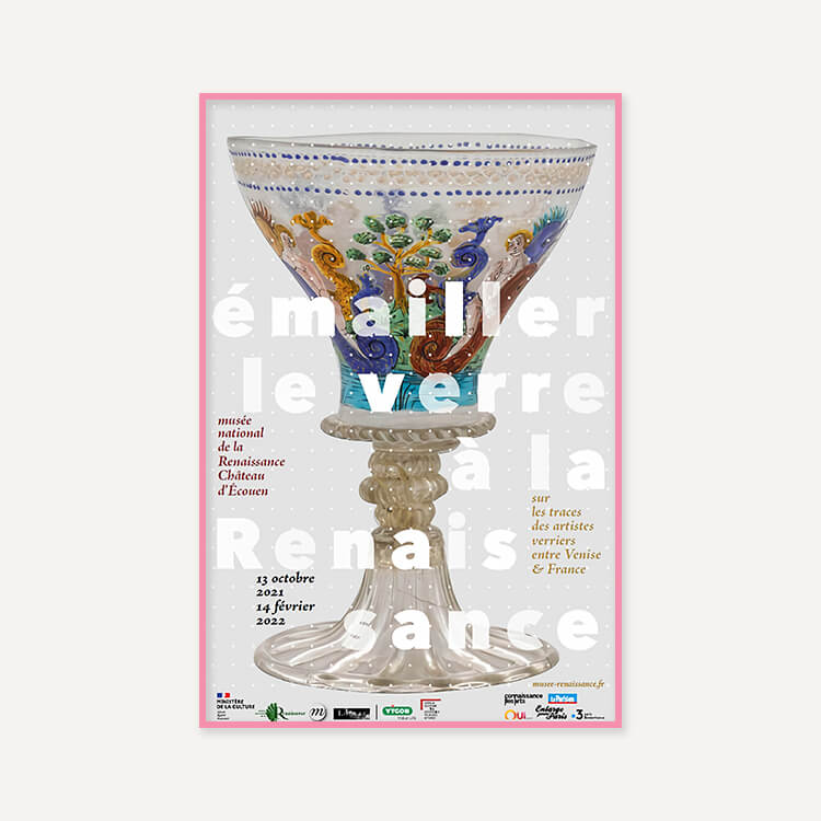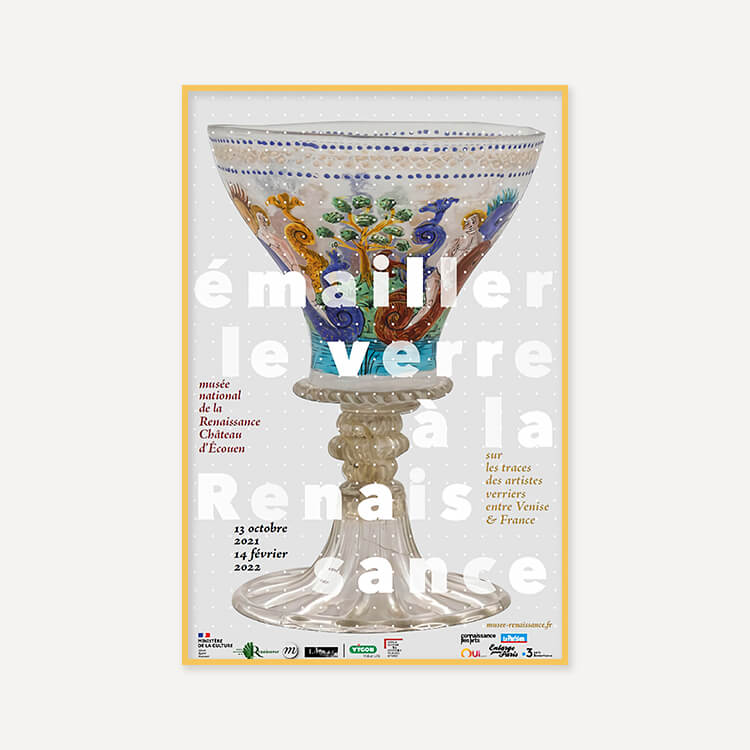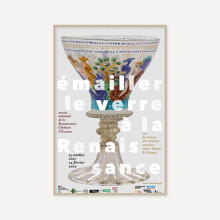 2021년 프랑스 르네상스 국립 박물관(Musée National de la Renaissance)에서 열린 〈Enameling glass in the Renaissance. In the footsteps of glass artists between Venice and France(르네상스 시대의 에나멜 유리-베니스와 프랑스 유리 예술가들의 발자취)〉 전시회 포스터입니다.
