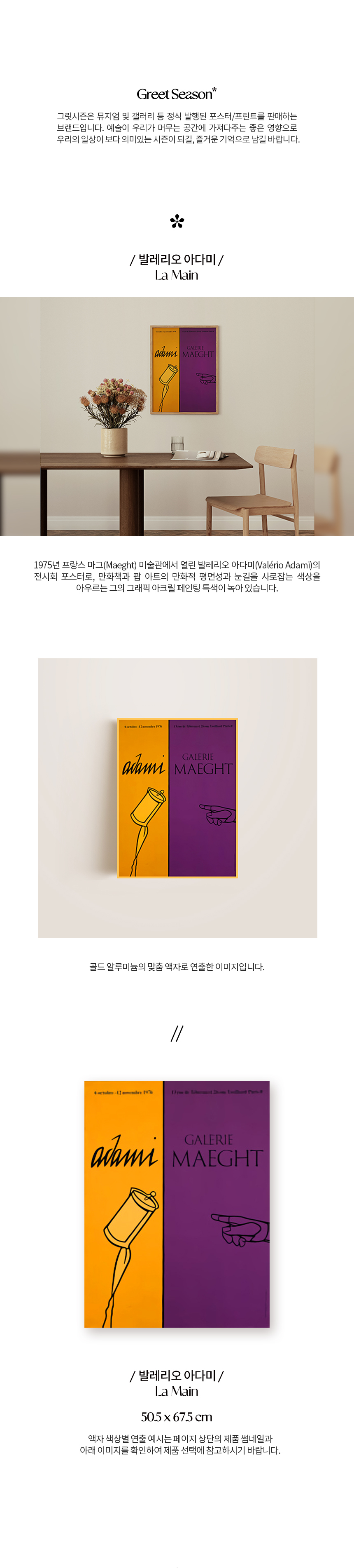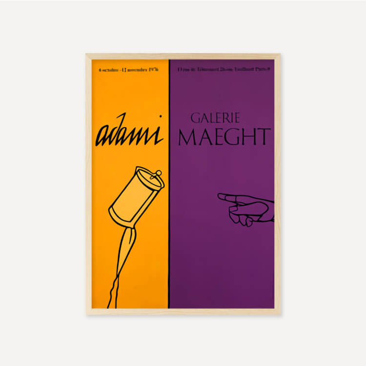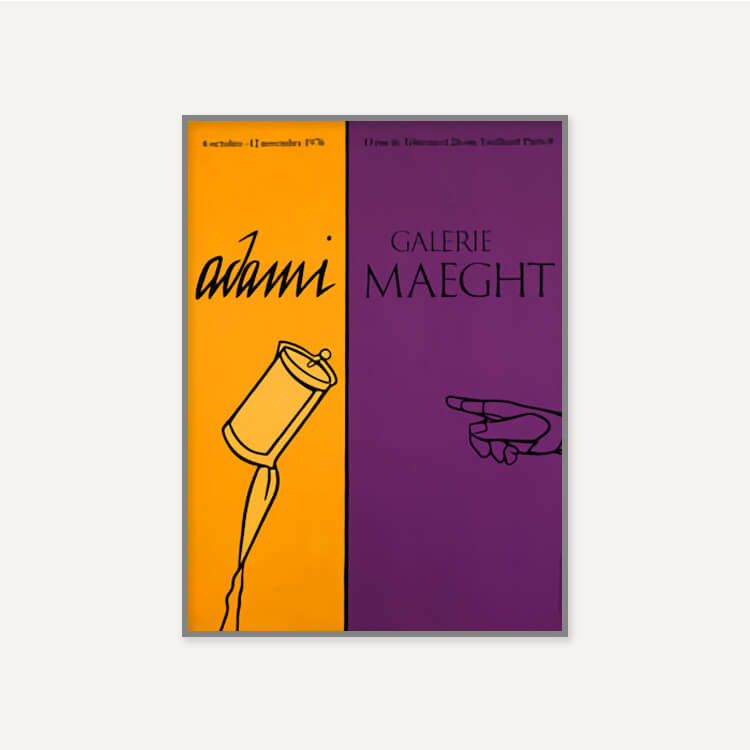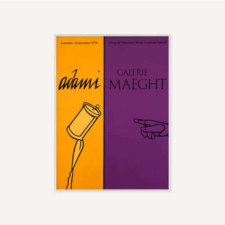 1976년 프랑스 마그(Maeght) 미술관에서 열린 발레리오 아다미(Valério Adami)의 전시회 포스터로, 만화책과 팝 아트의 만화적 평면성과 눈길을 사로잡는 색상을 아우르는 그의 그래픽 아크릴 페인팅 특색이 녹아 있습니다.