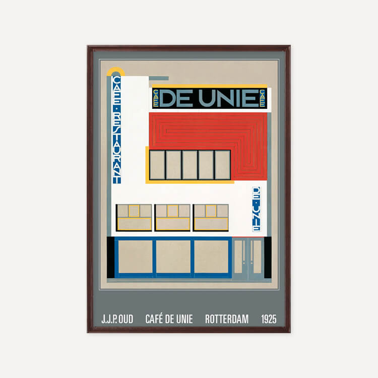 J.J.P.로 알려진 네덜란드 건축가 야코부스 요하네스 피테르 아우드(Jacobus Johannes Pieter Oud)가 디자인한 로테르담의 〈the Cafe de Unie〉 모습입니다. 이 디자인은 뜨거운 칼이 차가운 버터를 관통하듯 주변의 전통적인 네덜란드 건물들과 대조되었으며, 데 스틸 운동의 가장 중요한 아이콘 중 하나로 여겨집니다.