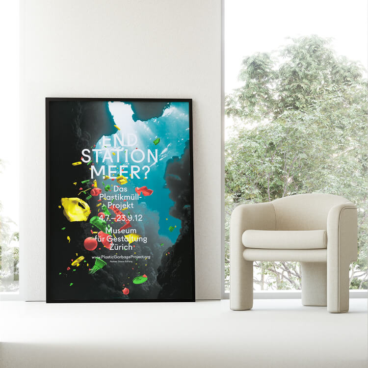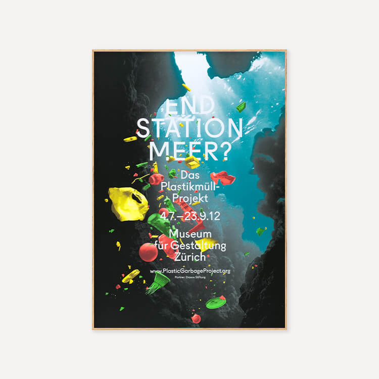 2023년 취리히 디자인 박물관(Museum fur Gestaltung Zurich)에서 열린 〈End Station Sea? - The Plastic Garbage Project〉 전시회 포스터입니다. 바다에서 발견되는 플라스틱 폐기물의 다양한 형태를 보여주었으며, 결과와 해결책이 예술적으로 제시되었습니다.