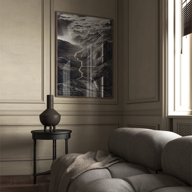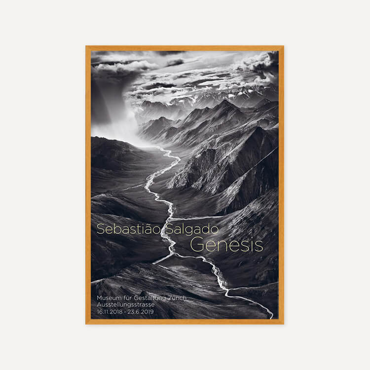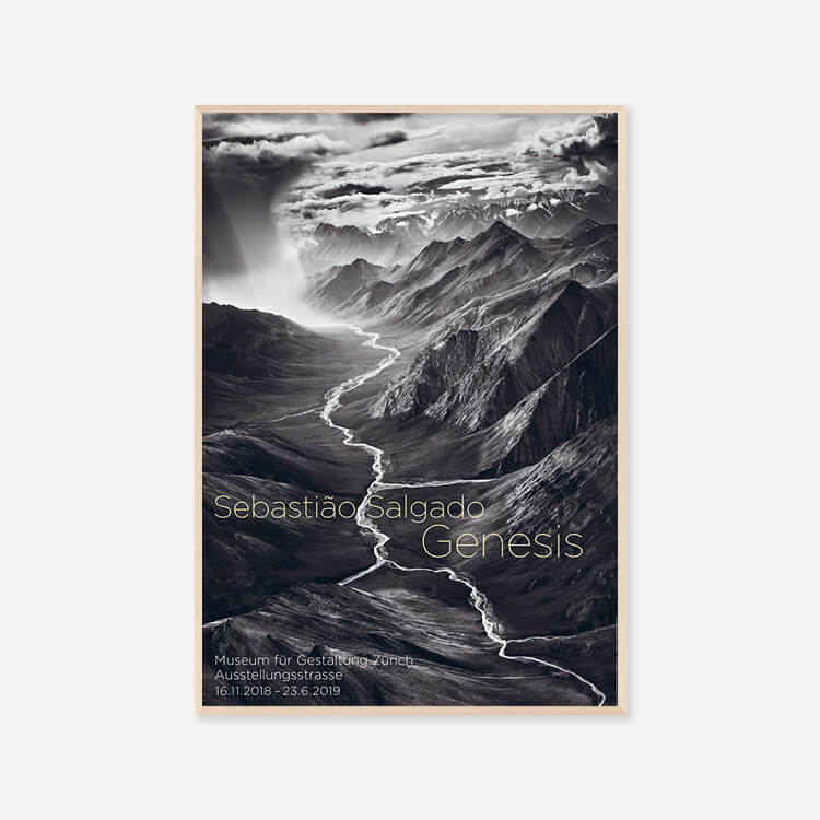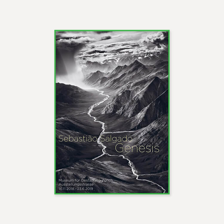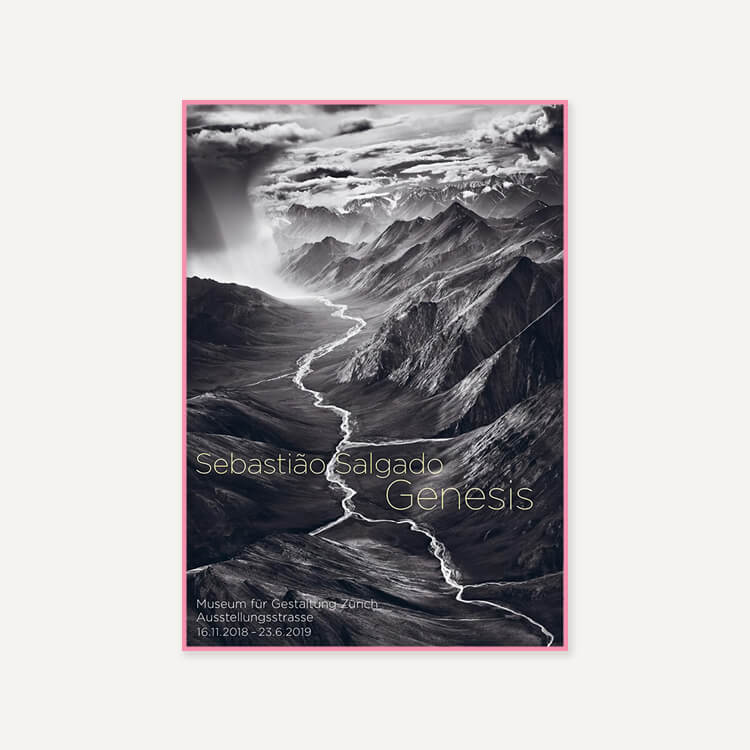 2018년 취리히 디자인 박물관(Museum fur Gestaltung Zurich)에서 열린 세바스티안 살가도(Sebastião Salgado)의 〈Genesis〉 전시회 포스터입니다. 그는 자연과 인류라는 주제에 초점을 맞춘 매우 까다로운 장기 프로젝트로 저명한 다큐멘터리 사진의 세계적 거장입니다.