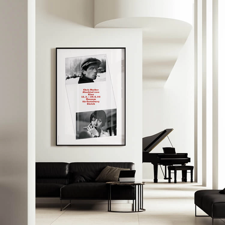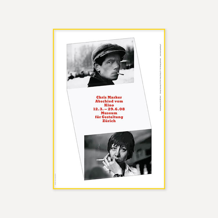 2008년 취리히 디자인 박물관(Museum fur Gestaltung Zurich)에서 열린 크리스 마르케(Chris Marker)의 〈A farewell to the cinema〉 전시회 포스터로, 이 전시를 통해 사진, 영화 클립, 비디오 설치 및 기타 미디어 작품을 선보였습니다.