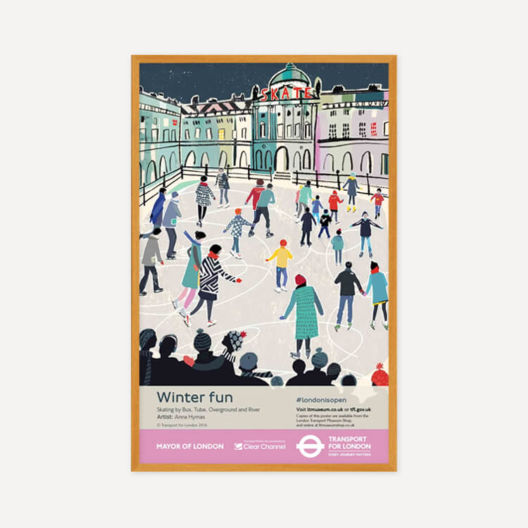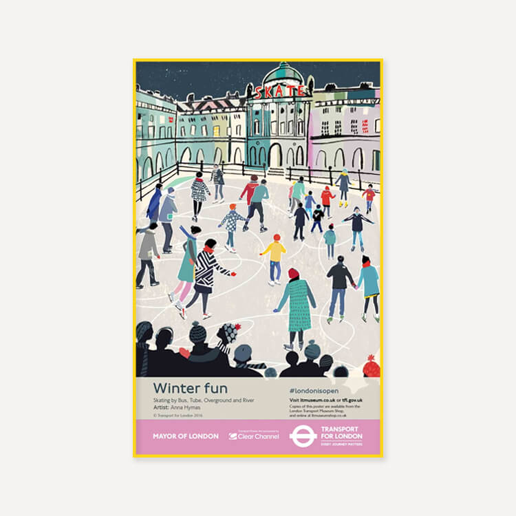 런던 교통공사를 위해 제작된 '겨울의 즐거움' 테마 포스터 중 하나로, 런던의 서머셋 하우스에서 스케이트를 즐기는 사람들의 모습을 담아냈습니다. 이를 통해 버스와 지하철이 비교적 여유로운 시간대와 주말에 사람들의 여행을 독려하고자 했습니다.