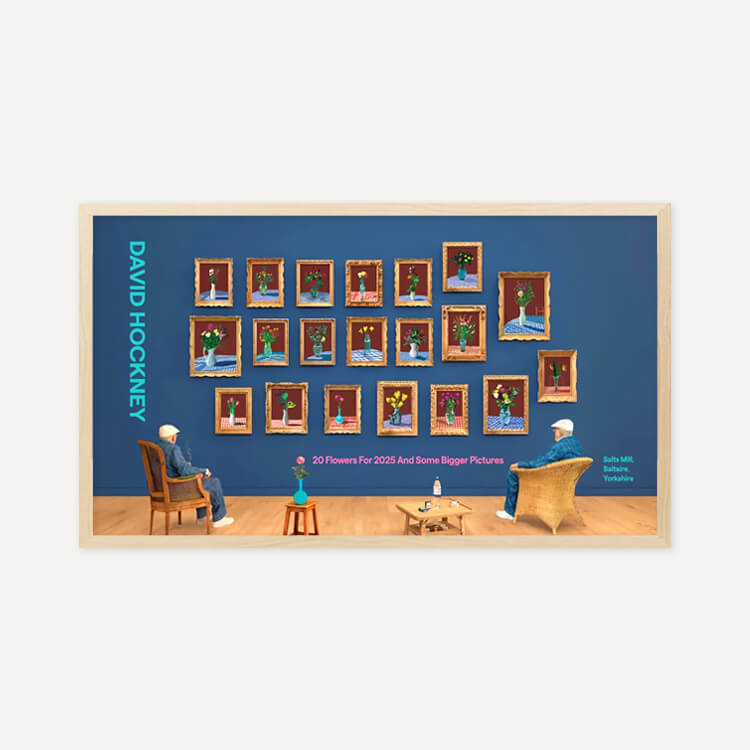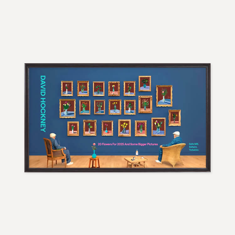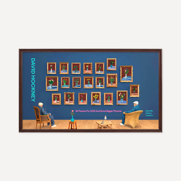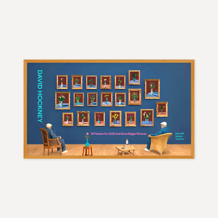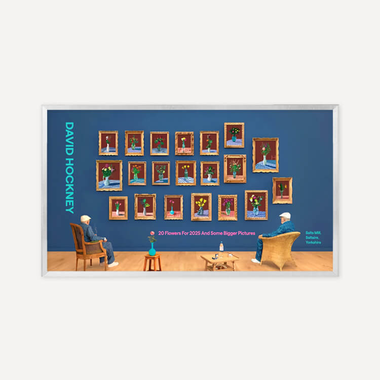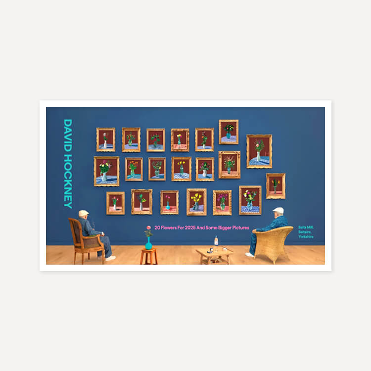 2025년 브래드퍼드의 영국 문화도시 지정을 기념해 영국 솔츠밀(Salts Mill)에서 열린 전시 〈20 Flowers For 2025 And Some Bigger Pictures〉를 위해 제작된 포스터로, 데이비드 호크니(David Hockney)의 〈25th June 2022, Looking at the Flowers (Framed)〉를 담고 있습니다. 두 명의 호크니가 20송이 꽃을 바라보며 앉아 있는 이 작품은, 3D 촬영과 컴퓨터 합성을 활용한 ‘포토그래픽 드로잉’ 기법으로, 호크니가 새로운 형태의 사진이라 부르는 실험적 작업입니다.