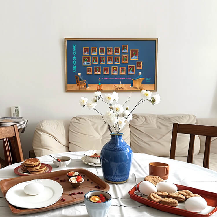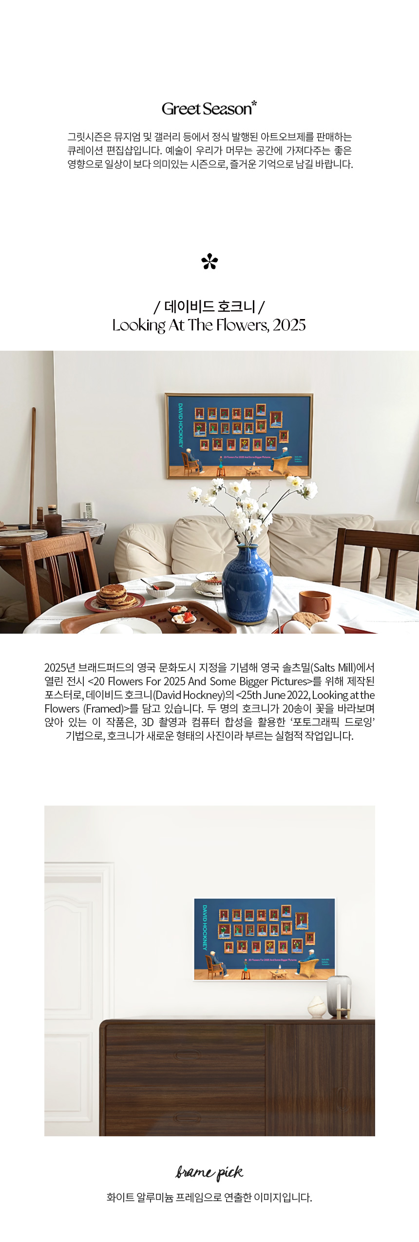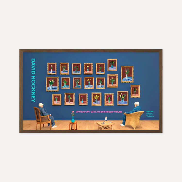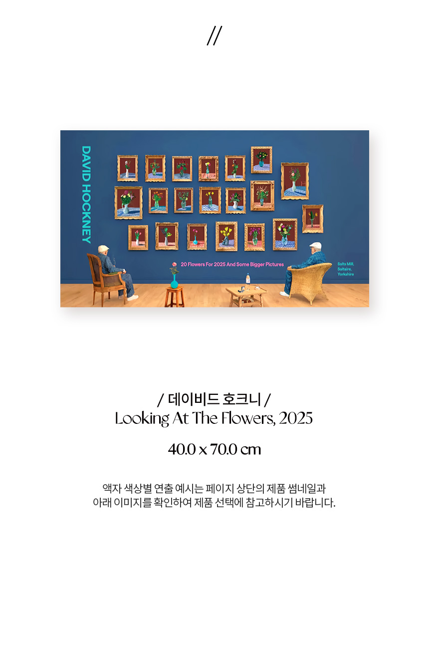 2025년 브래드퍼드의 영국 문화도시 지정을 기념해 영국 솔츠밀(Salts Mill)에서 열린 전시 〈20 Flowers For 2025 And Some Bigger Pictures〉를 위해 제작된 포스터로, 데이비드 호크니(David Hockney)의 〈25th June 2022, Looking at the Flowers (Framed)〉를 담고 있습니다. 두 명의 호크니가 20송이 꽃을 바라보며 앉아 있는 이 작품은, 3D 촬영과 컴퓨터 합성을 활용한 ‘포토그래픽 드로잉’ 기법으로, 호크니가 새로운 형태의 사진이라 부르는 실험적 작업입니다.