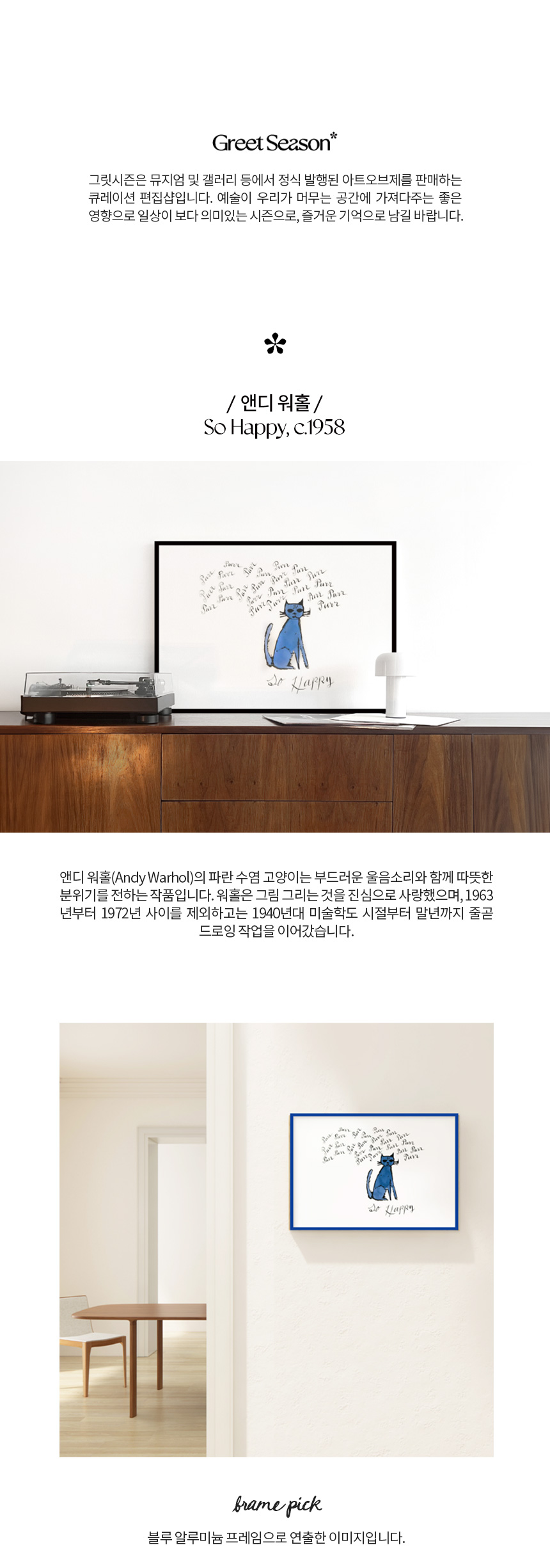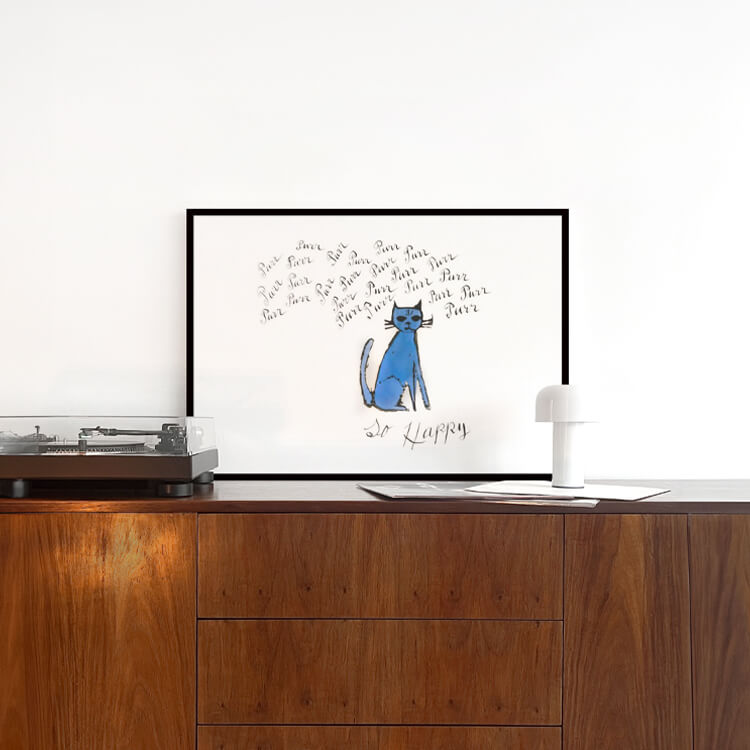 앤디 워홀(Andy Warhol)의 파란 수염 고양이는 부드러운 울음소리와 함께 따뜻한 분위기를 전하는 작품입니다. 워홀은 그림 그리는 것을 진심으로 사랑했으며, 1963년부터 1972년 사이를 제외하고는 1940년대 미술학도 시절부터 말년까지 줄곧 드로잉 작업을 이어갔습니다.