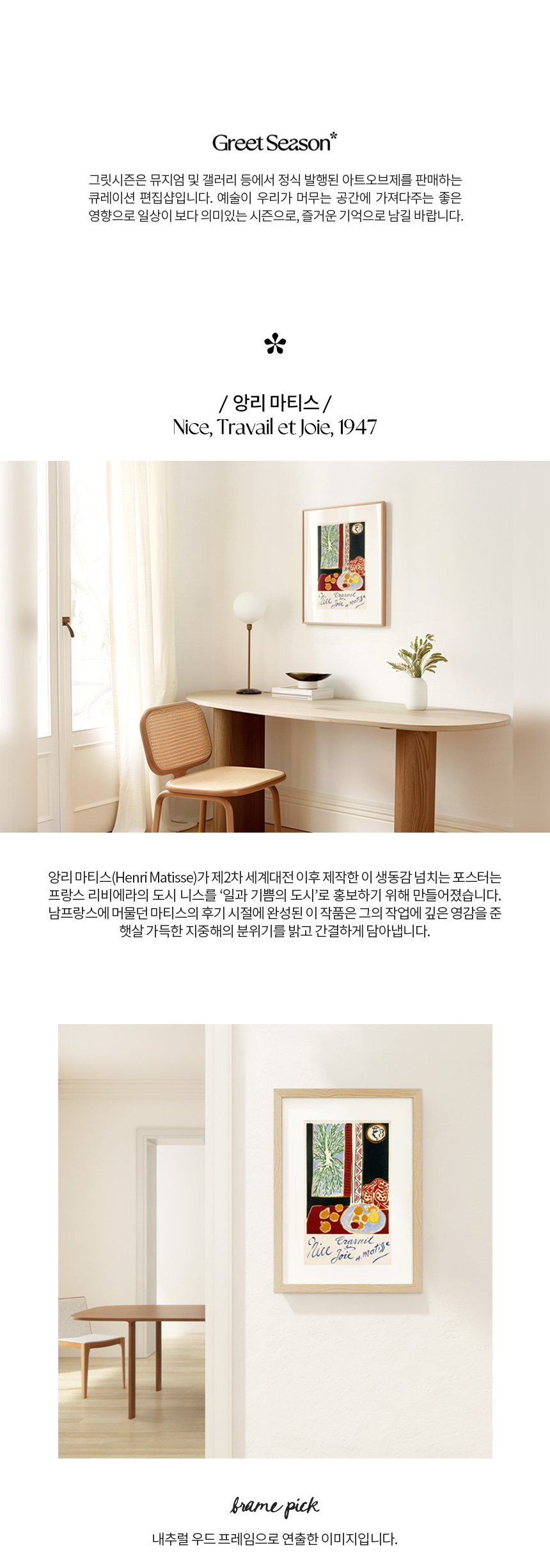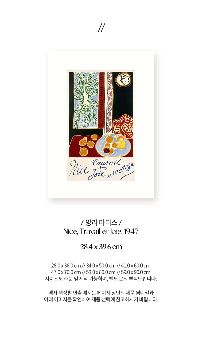 앙리 마티스(Henri Matisse)가 제2차 세계대전 이후 제작한 이 생동감 넘치는 포스터는 프랑스 리비에라의 도시 니스를 '일과 기쁨의 도시'로 홍보하기 위해 만들어졌습니다. 남프랑스에 머물던 마티스의 후기 시절에 완성된 이 작품은 그의 작업에 깊은 영감을 준 햇살 가득한 지중해의 분위기를 밝고 간결하게 담아냅니다.