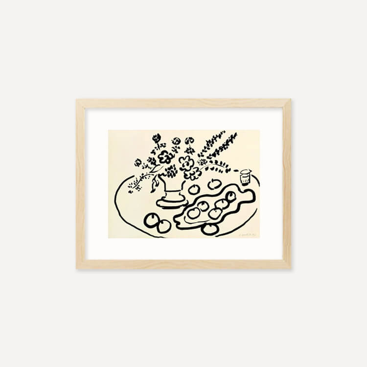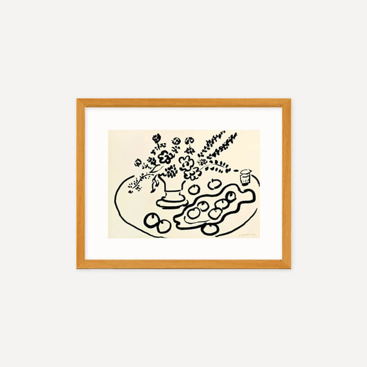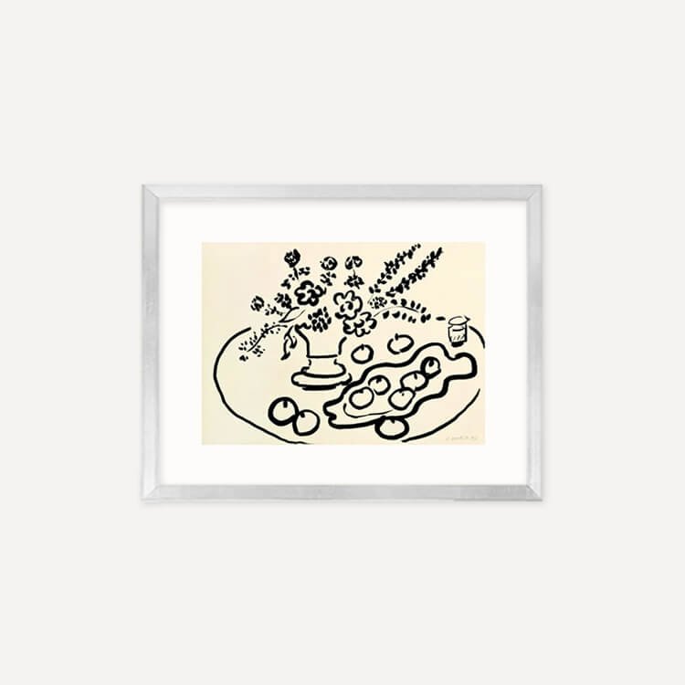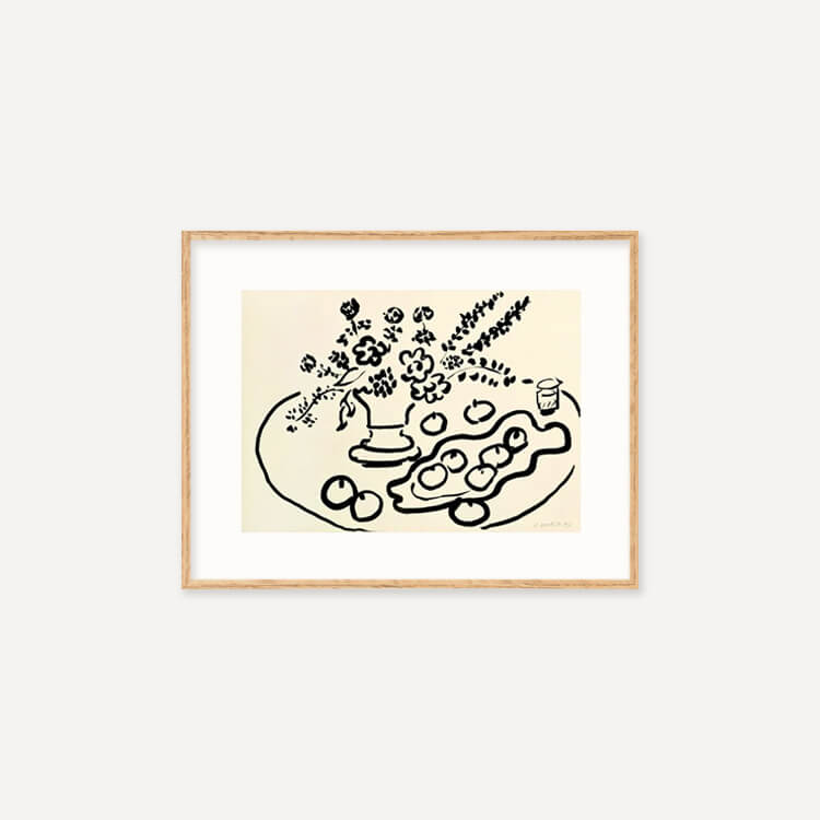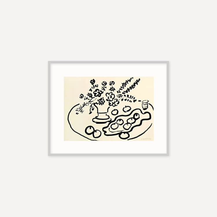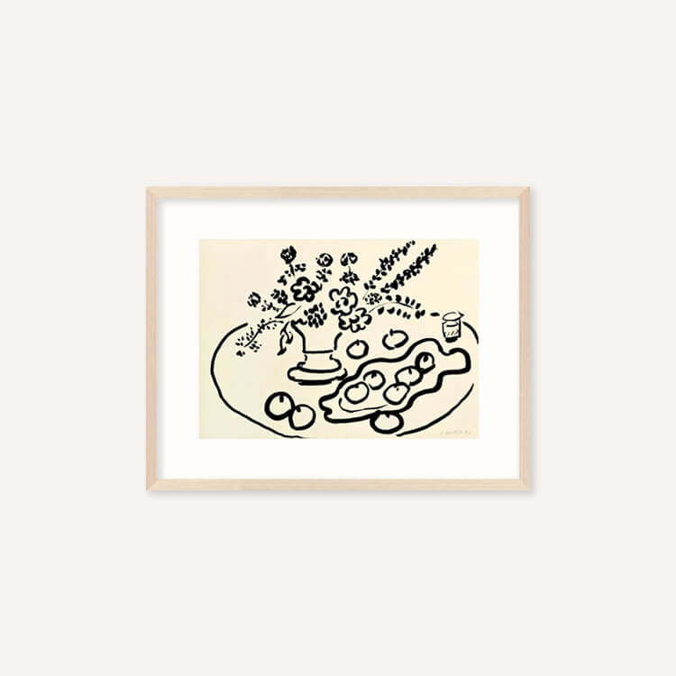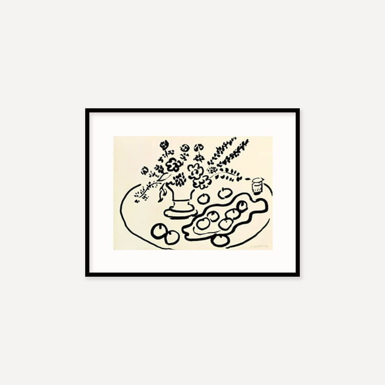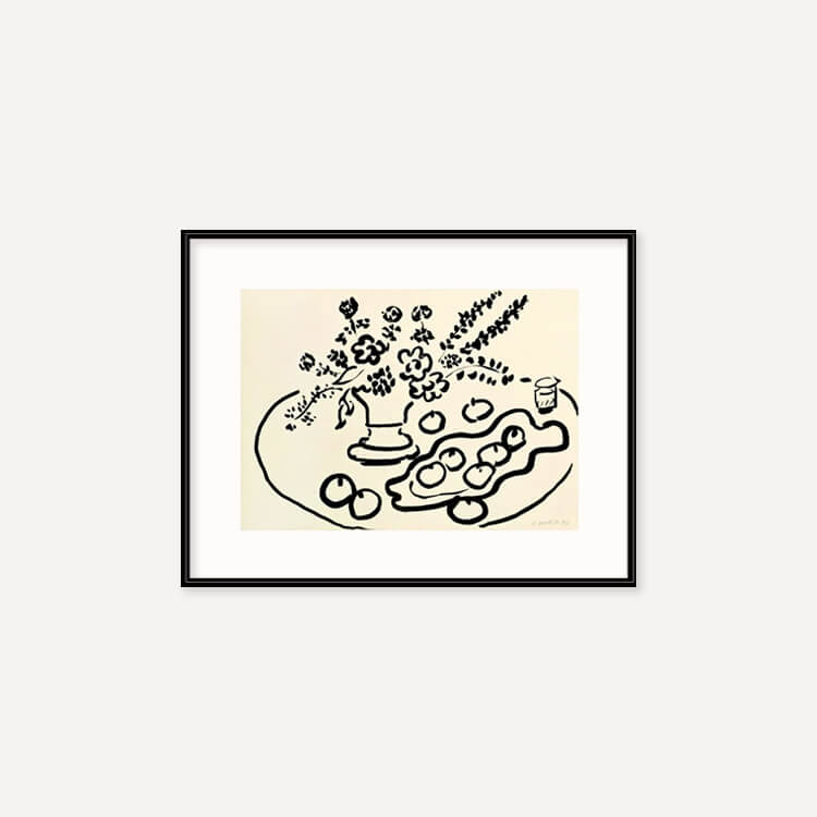 앙리 마티스(Henri Matisse)의 1947년 작품 〈Still Life with Vase of Flowers and Plate of Fruit〉은 대담하고 단순화된 선으로 구성된 정물화를 통해 그의 독창적인 표현 방식을 잘 보여줍니다. 단색의 구성임에도 불구하고, 생생한 에너지가 느껴지는 이 작품은 마티스 특유의 조형 감각으로 평범한 정물 장면을 세련되게 끌어올립니다.