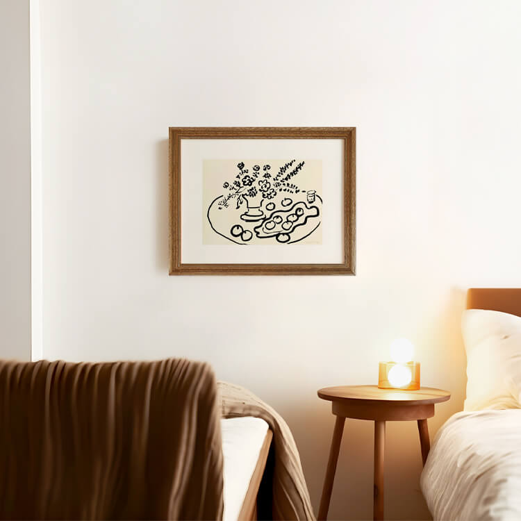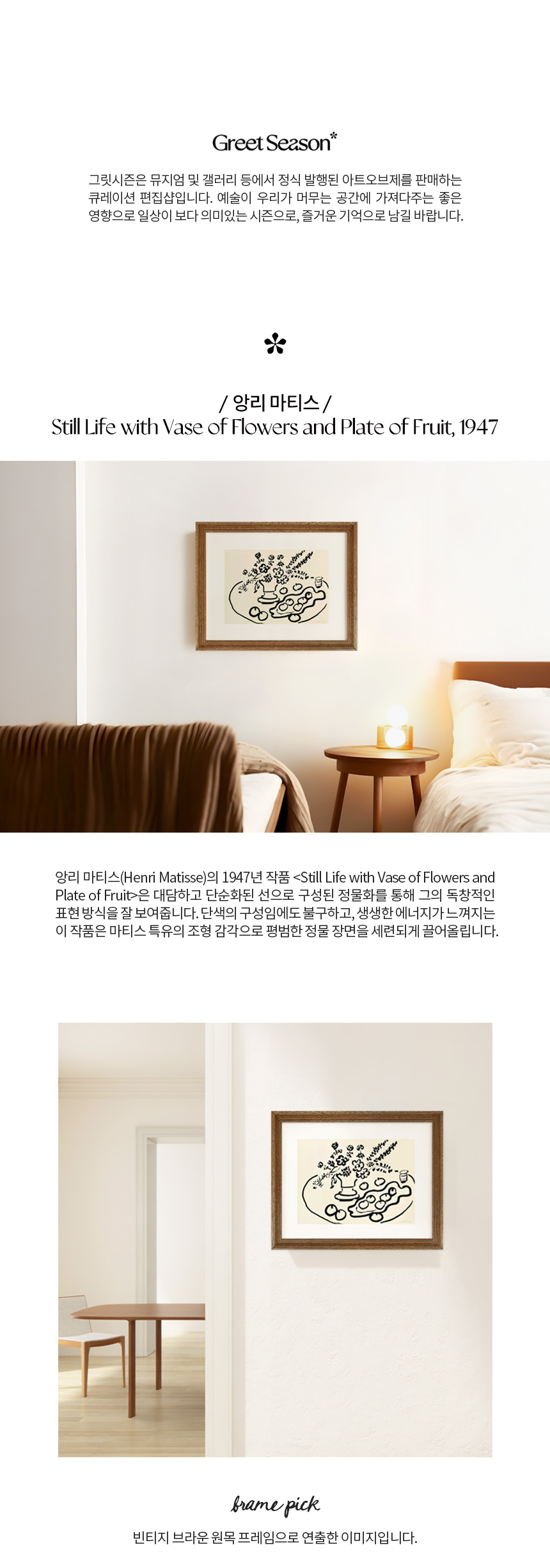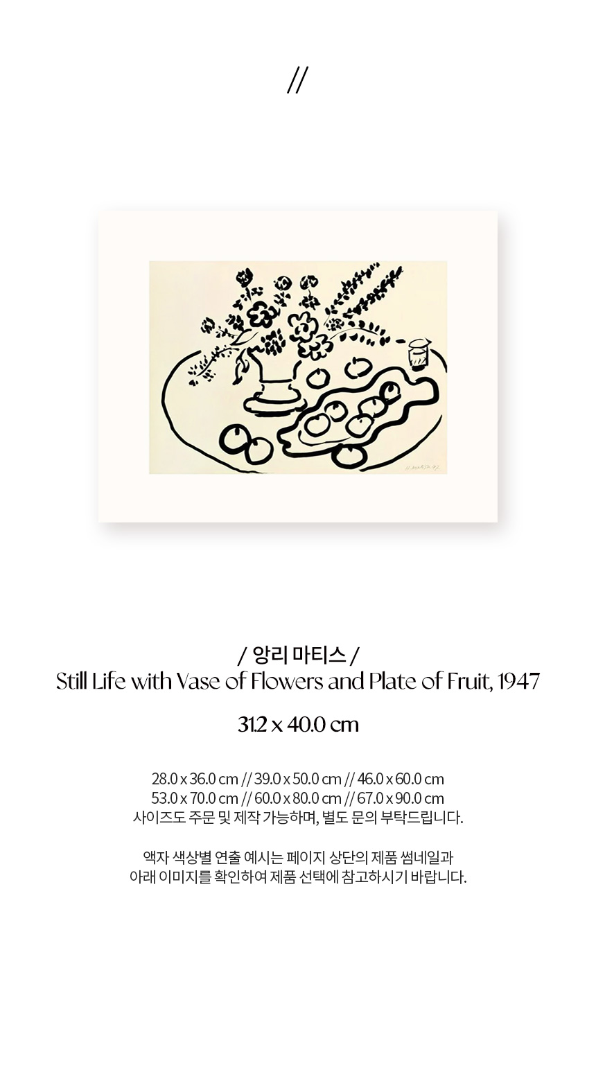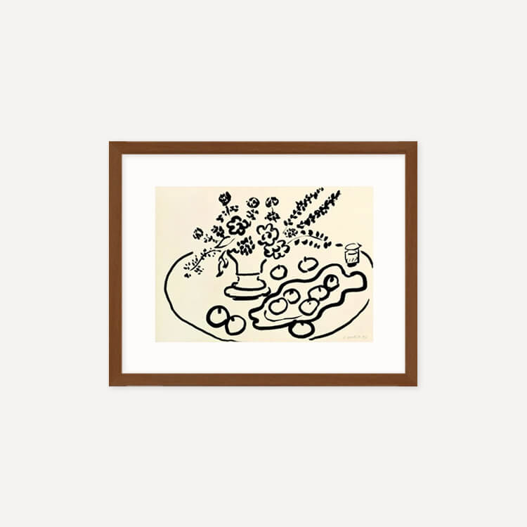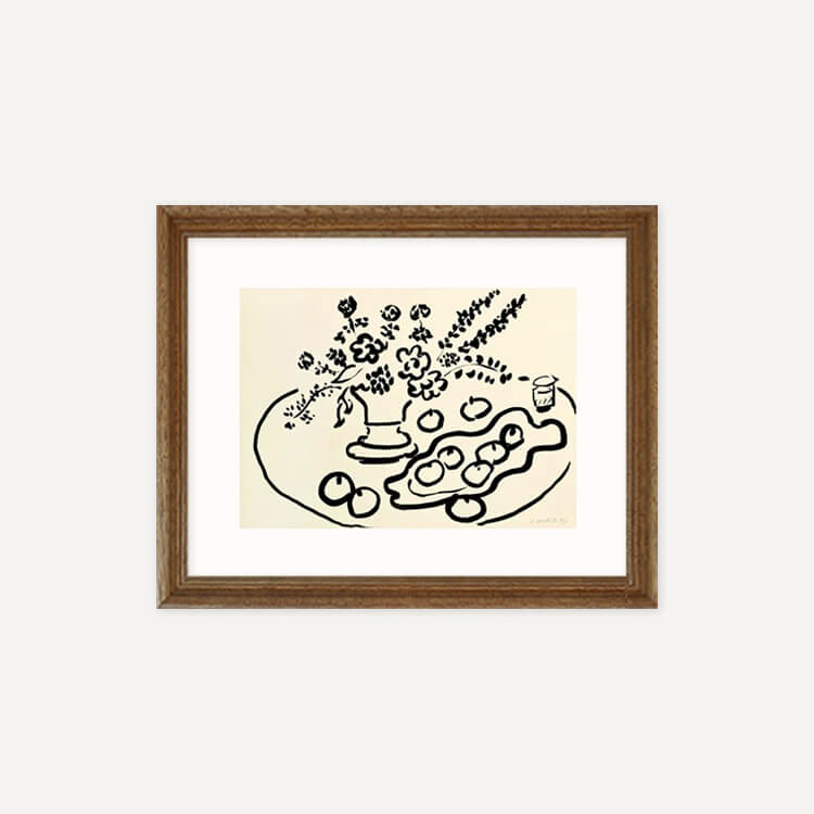 앙리 마티스(Henri Matisse)의 1947년 작품 〈Still Life with Vase of Flowers and Plate of Fruit〉은 대담하고 단순화된 선으로 구성된 정물화를 통해 그의 독창적인 표현 방식을 잘 보여줍니다. 단색의 구성임에도 불구하고, 생생한 에너지가 느껴지는 이 작품은 마티스 특유의 조형 감각으로 평범한 정물 장면을 세련되게 끌어올립니다.