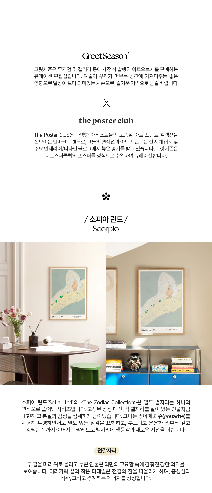 두 팔을 머리 위로 올리고 누운 인물은 외면의 고요함 속에 감춰진 강한 의지를 보여줍니다. 머리카락 끝의 작은 디테일은 전갈의 침을 떠올리게 하며, 충성심과 직관, 그리고 경계하는 에너지를 상징합니다.