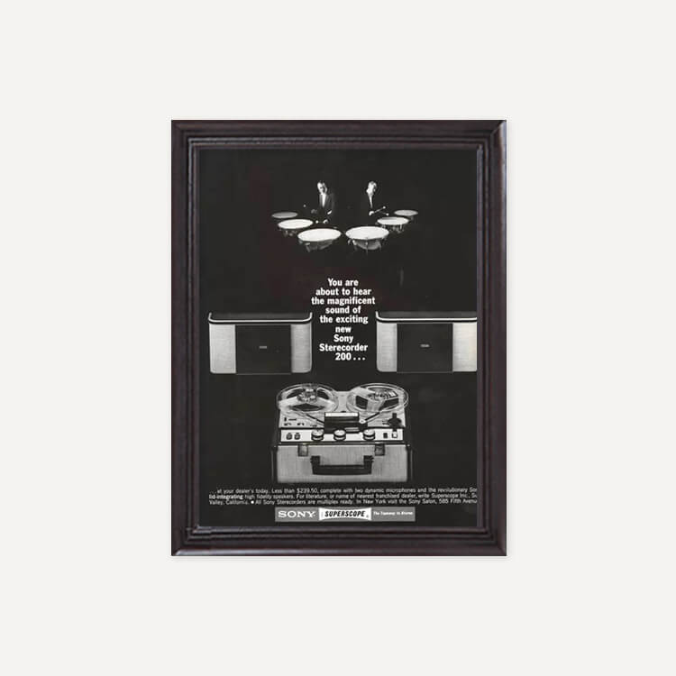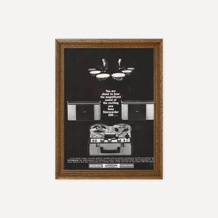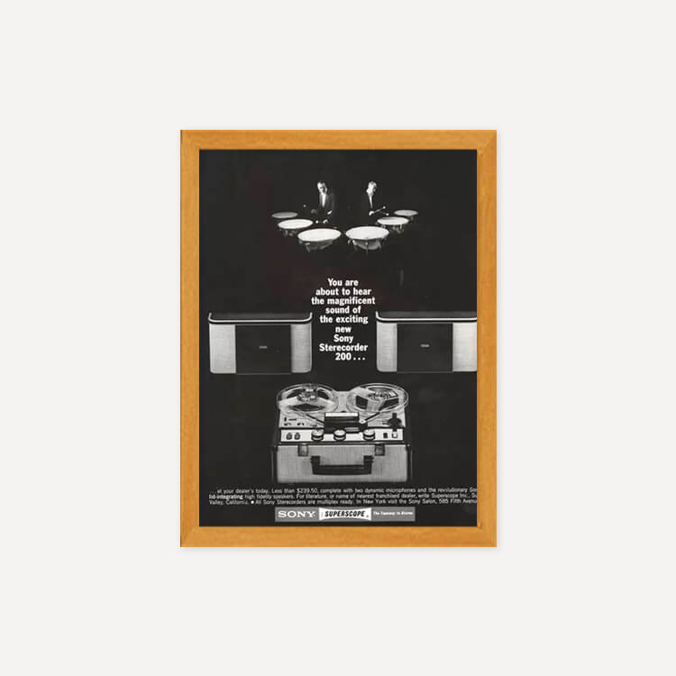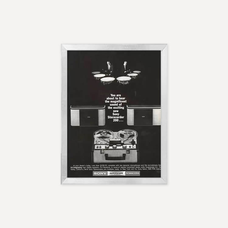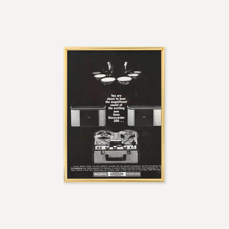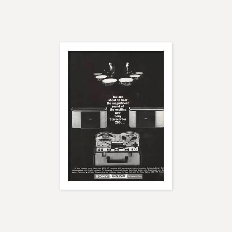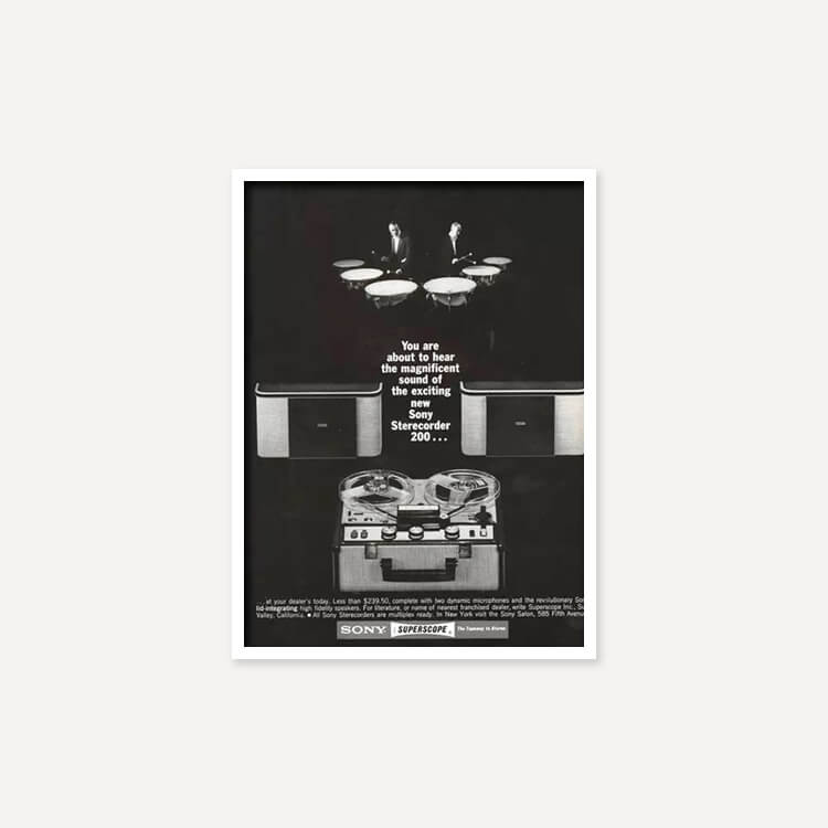 1964년 미국 잡지에 실린 소니 스피커(SONY Sterecorder 200 Reel-to-Reel with Speakers) 광고물로, 60년 이상 보존된 오리지널 빈티지 포스터입니다.