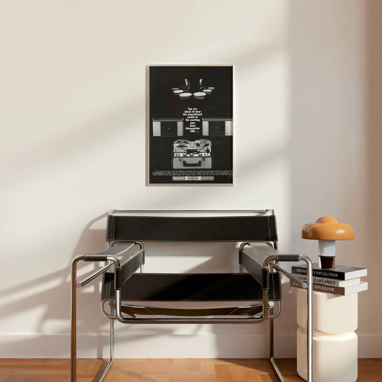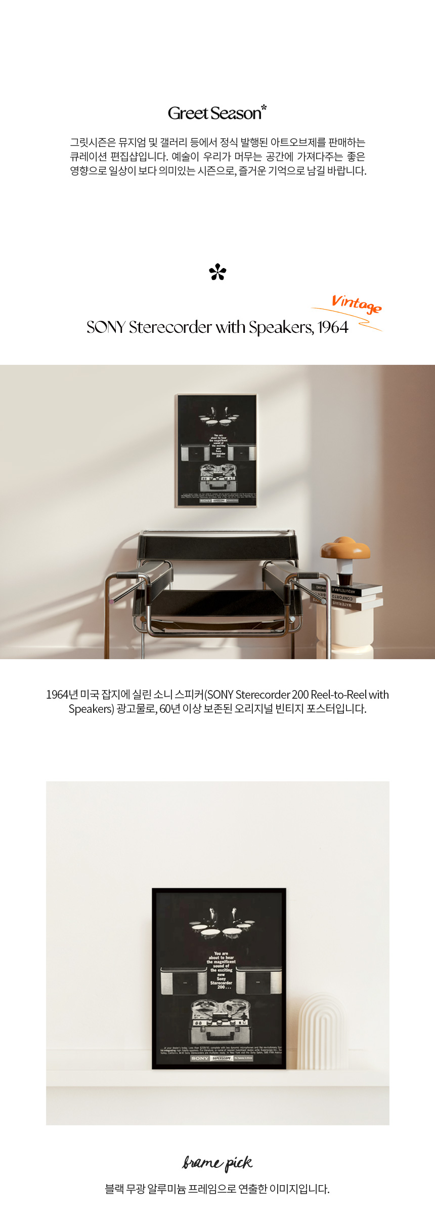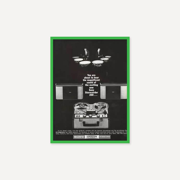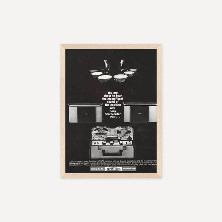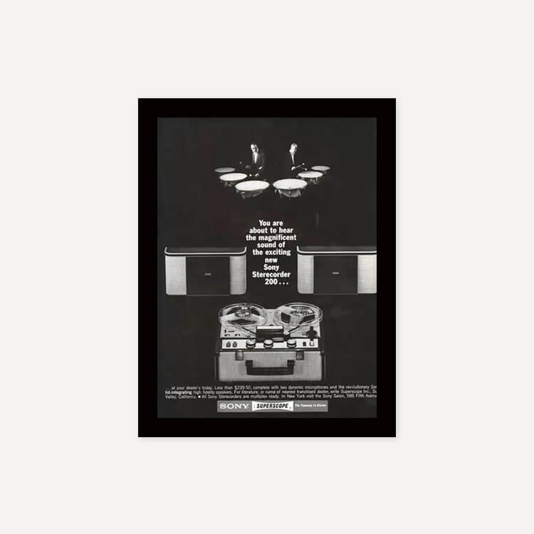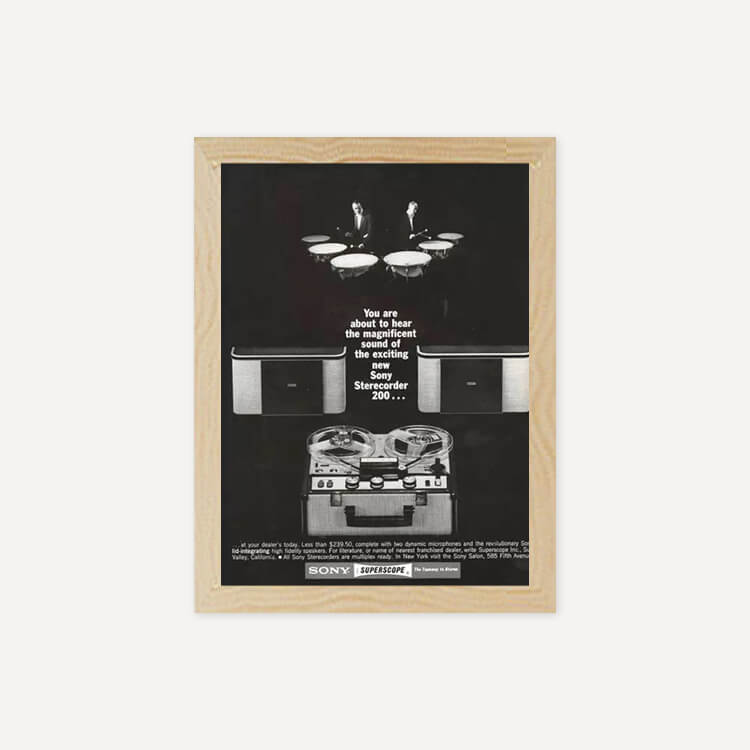 1964년 미국 잡지에 실린 소니 스피커(SONY Sterecorder 200 Reel-to-Reel with Speakers) 광고물로, 60년 이상 보존된 오리지널 빈티지 포스터입니다.