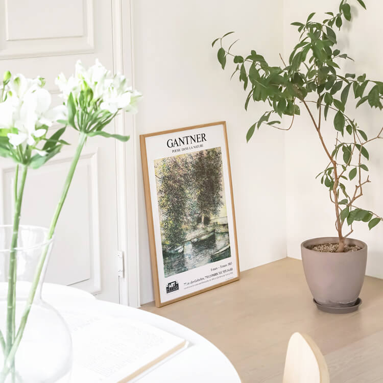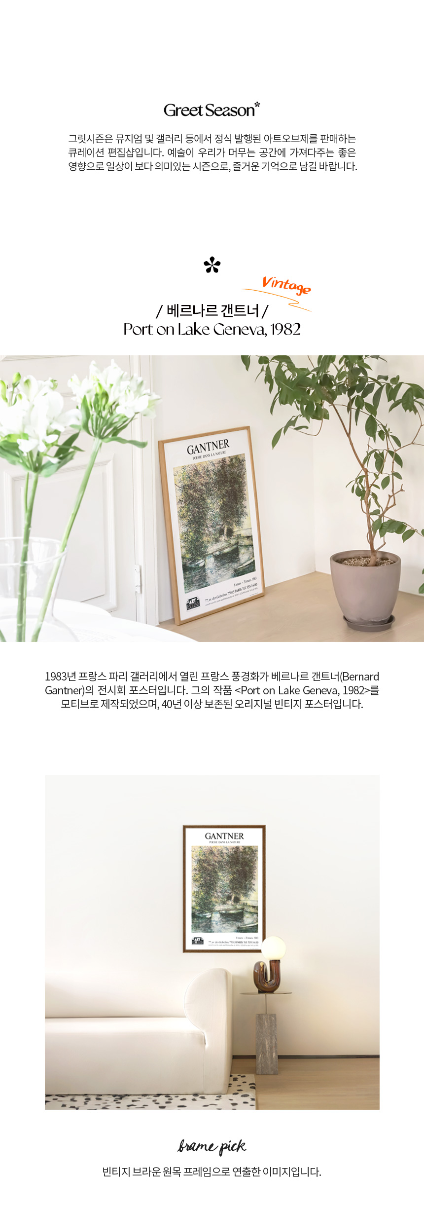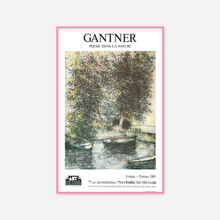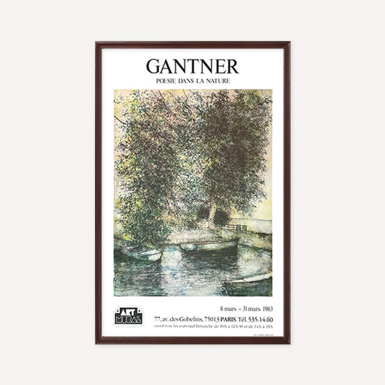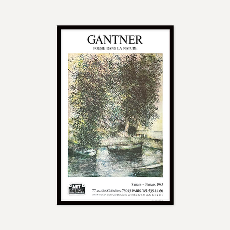 1983년 프랑스 파리 갤러리에서 열린 프랑스 풍경화가 베르나르 갠트너(Bernard Gantner)의 전시회 포스터입니다. 그의 작품 〈Port on Lake Geneva, 1982〉를 모티브로 제작되었으며, 40년 이상 보존된 오리지널 빈티지 포스터입니다.