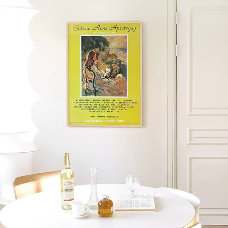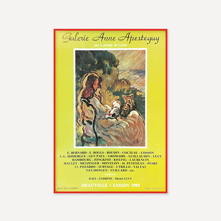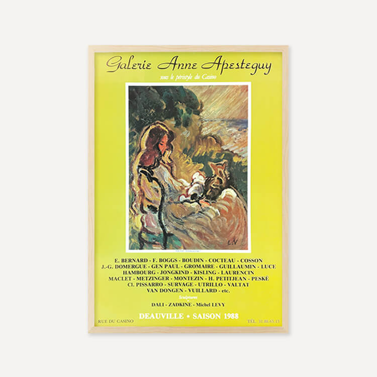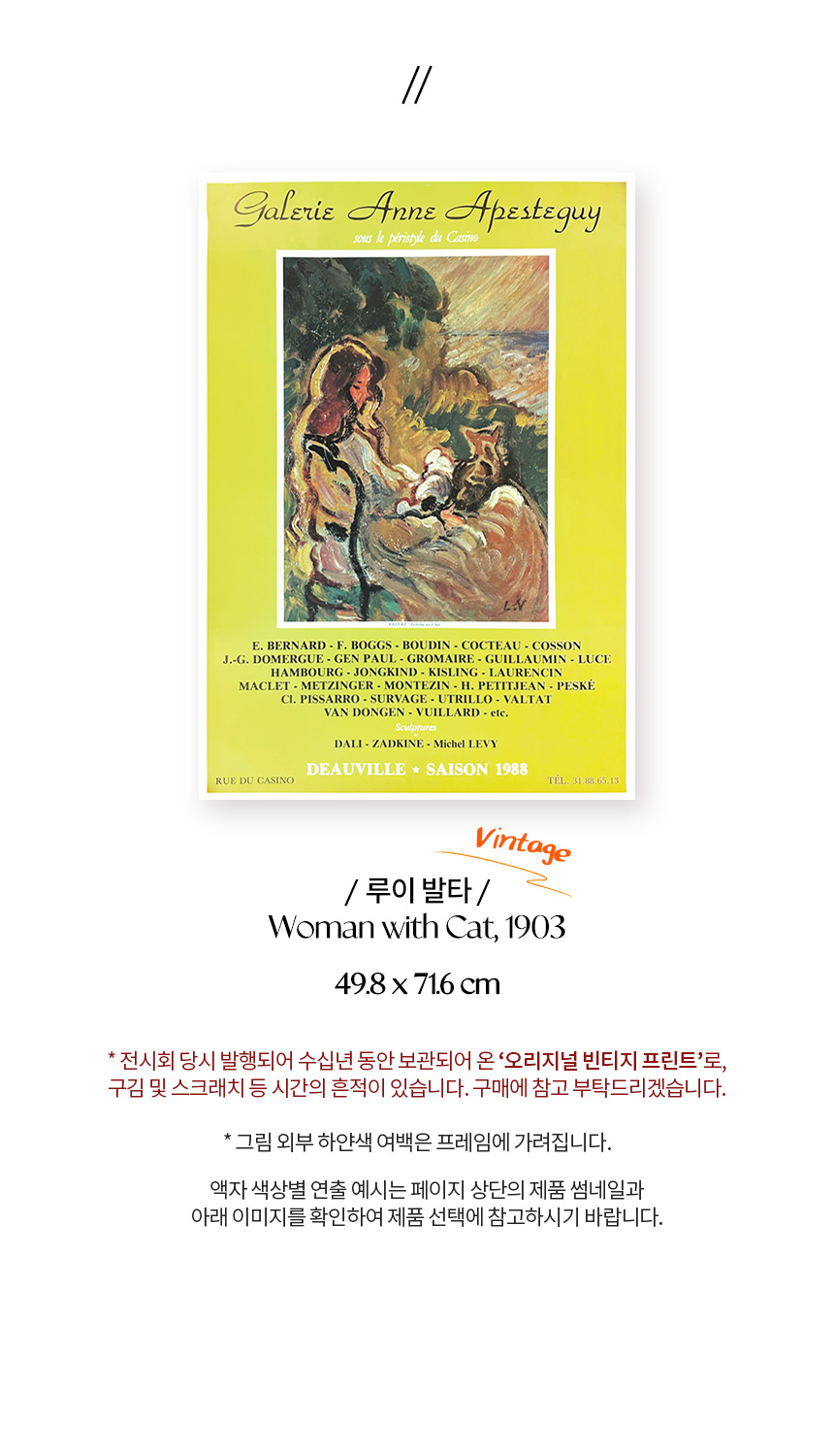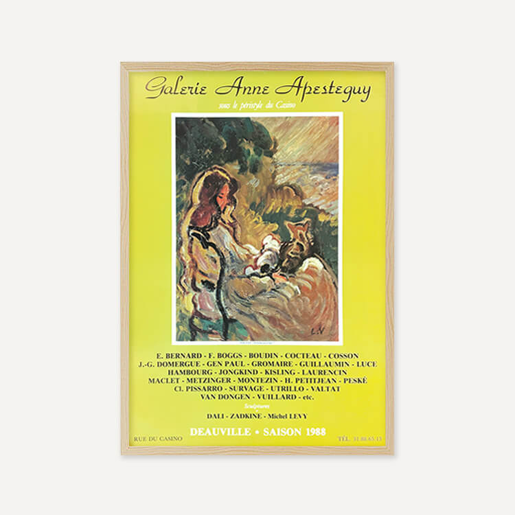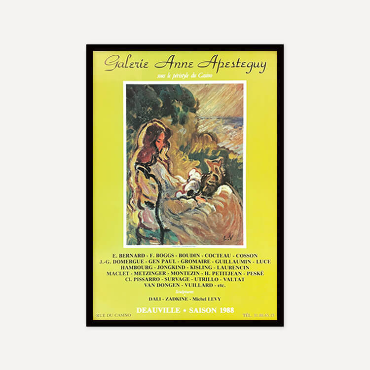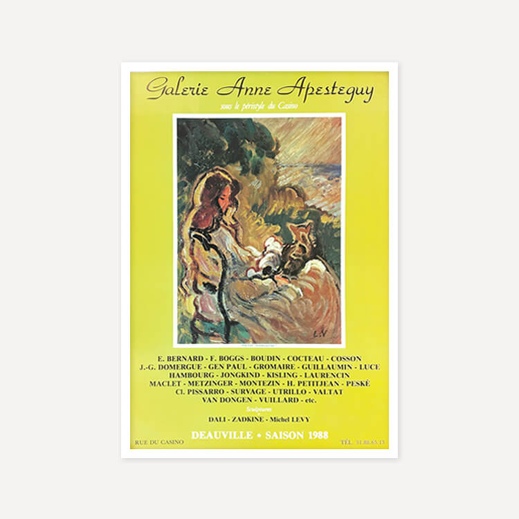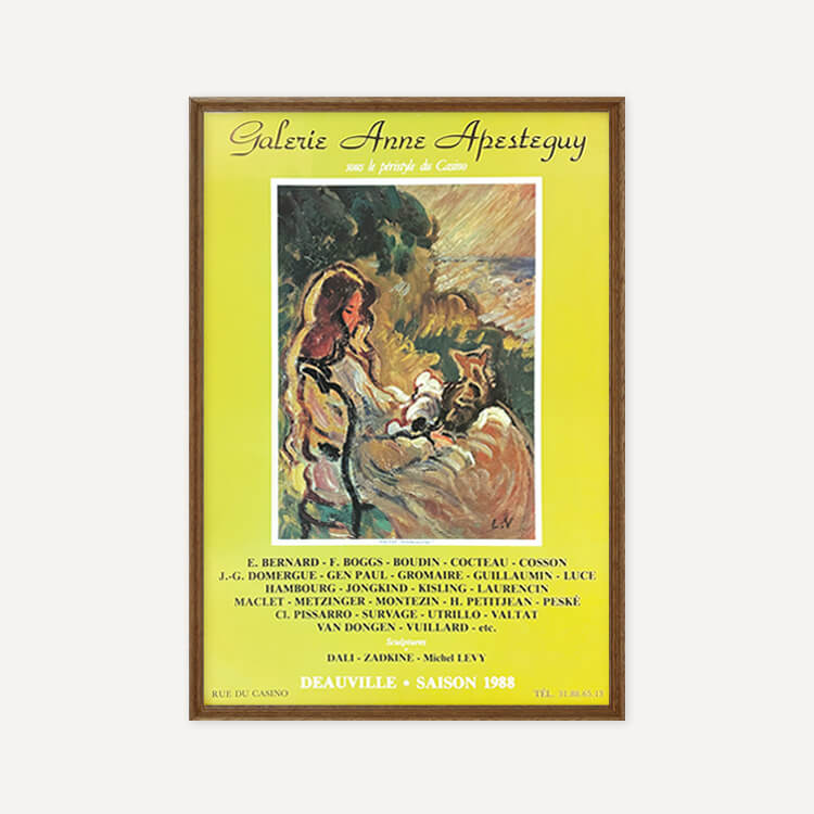 1983년 프랑스 도빌 Anne Apesteguy 갤러리에서 열린 그룹 전시 포스터입니다. 프랑스 화가 루이 발타(Louis Valtat)의 작품 〈Woman with Cat, 1903〉을 모티브로 제작되었으며, 40년 이상 보존된 오리지널 빈티지 포스터입니다.